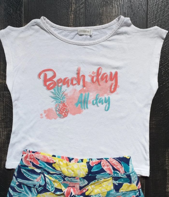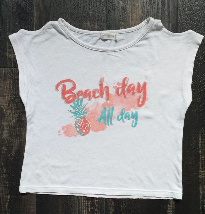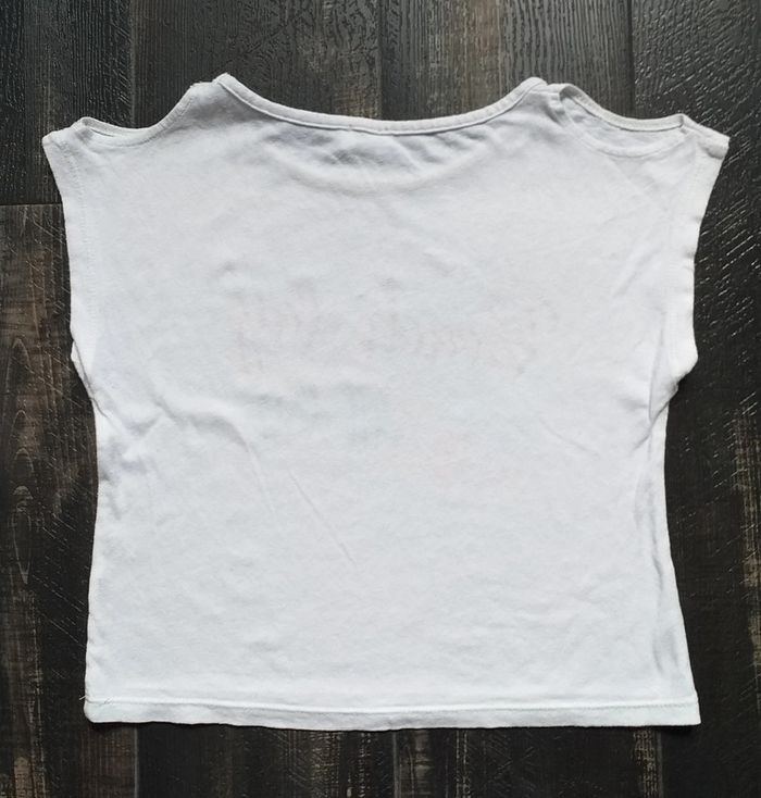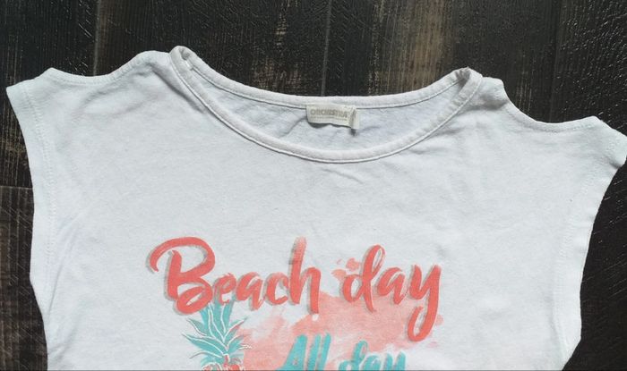 T-shirt blanc en coton gratté avec imprimé devant dans les tons corail et turquoise. Coupe droite et ample. Détail de coupe : épaules dénudées. Taille : 6 ans, mais peut être porté jusqu'au 8 ans. En très bon état.