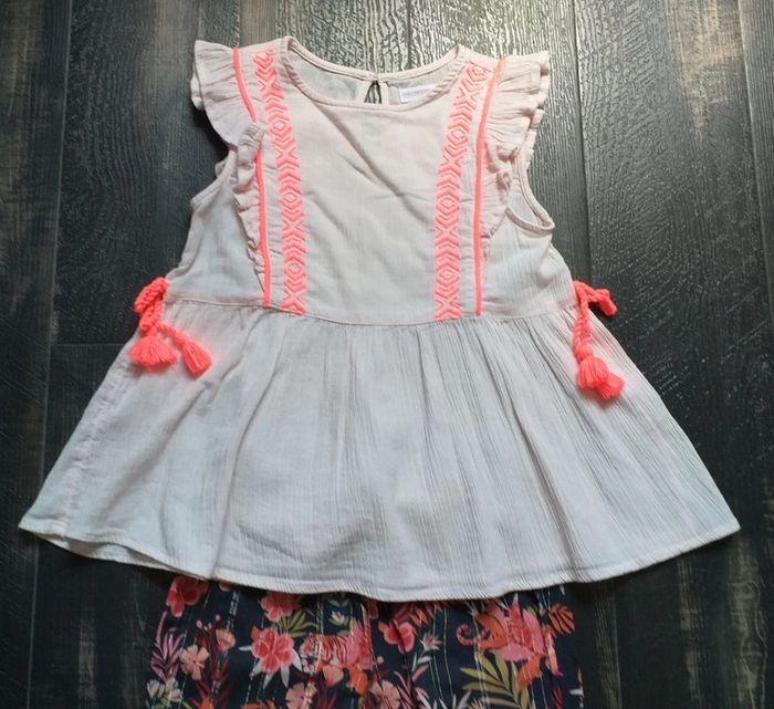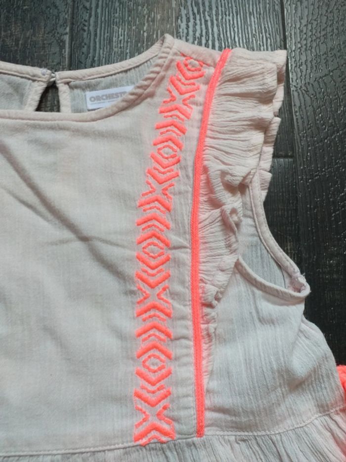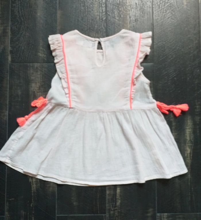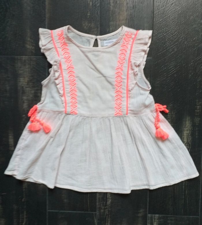 Tunique manches courtes en tissu gaufré écru. Encolure ronde, manches volantées avec finition picots contrastés, coupe évasée, ouverture dos boutonnée. Finitions avec pompons et surpiqûres roses corail fluo. En très bon état.