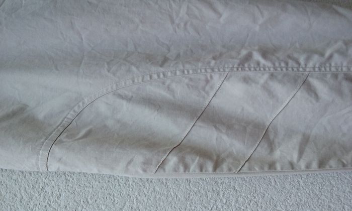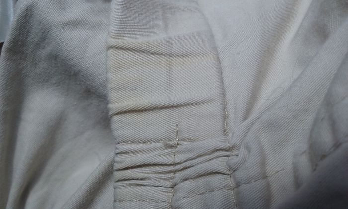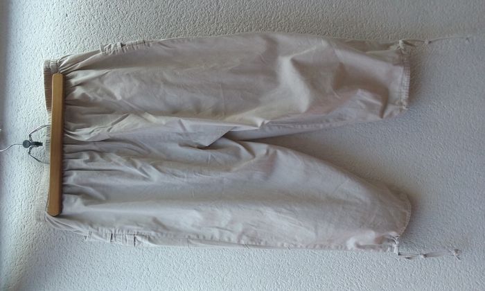 Taille élastiquée, 2 poches, cordon de serrage au bas du pantalon, 95% coton-5% élasthanne, en excellent état mis à part une tâche jaunâtre discrète au niveau de la ceinture devant (cf dernière photo)!