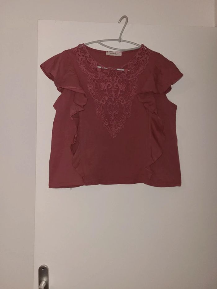Tee shirt femme manche courte vieux rose avec dentelle. Taille 42, très bon état. 100% coton.