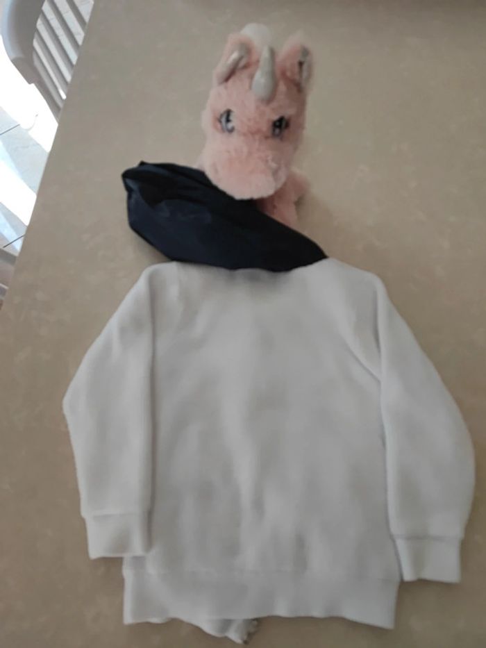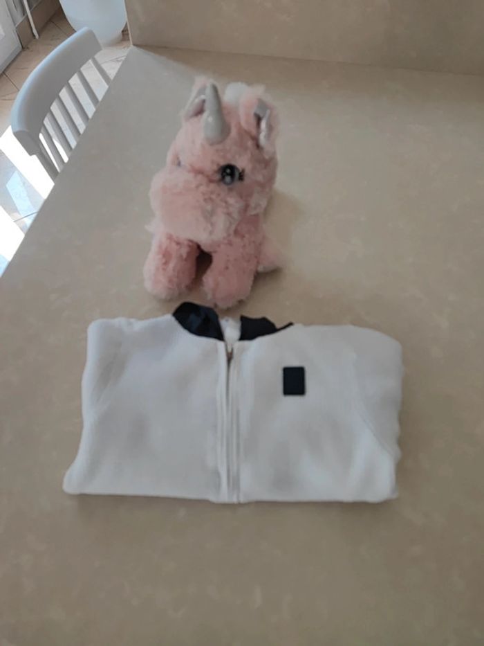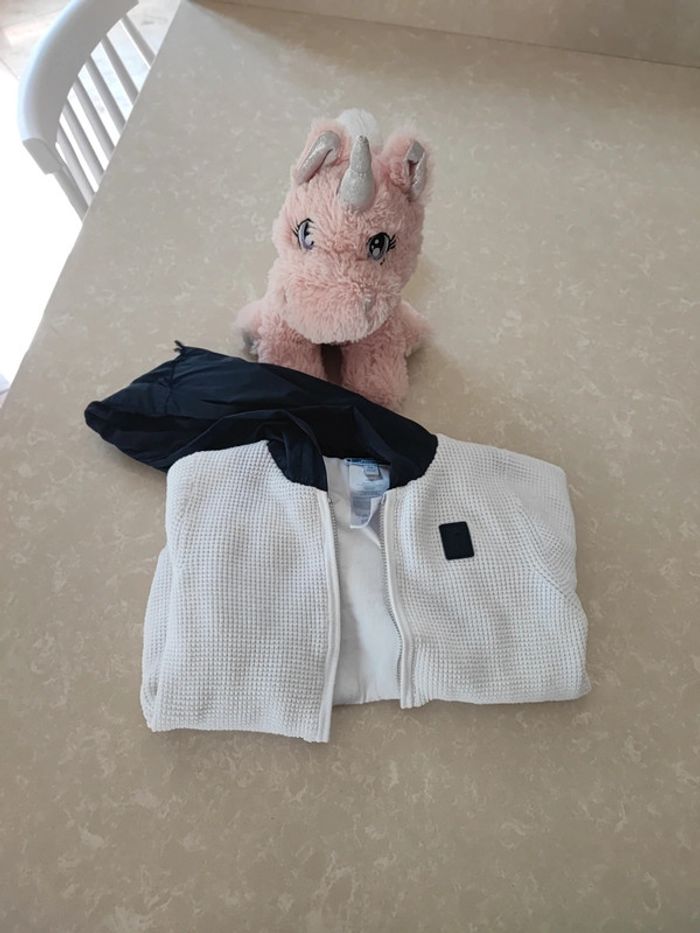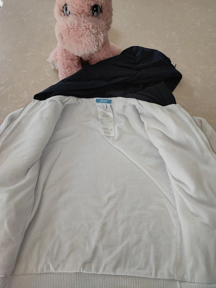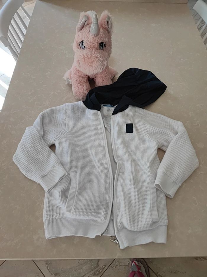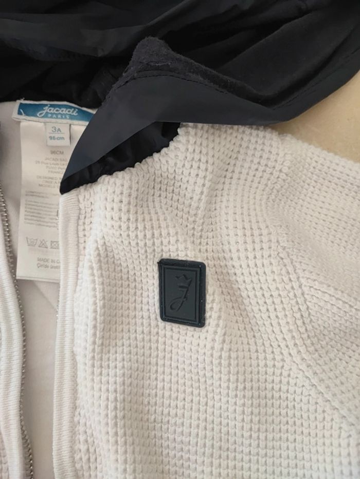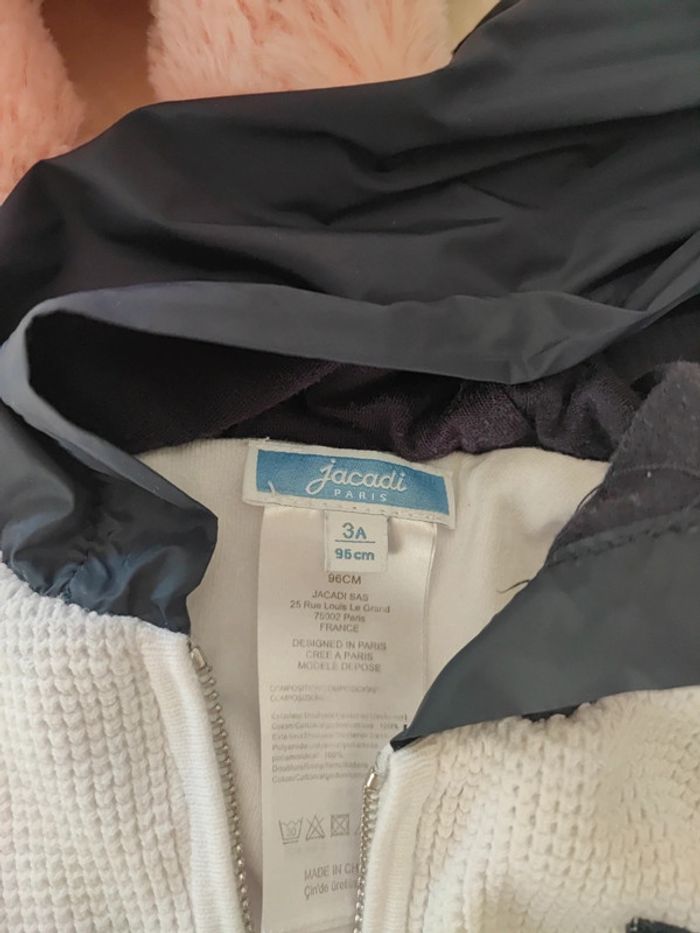Gilet zippé jacadi blanc avec capuche légère bleue. #pepettechoupette_3ans #gilerzippeàcapuche #giletzippé3ans #giletjacadi
