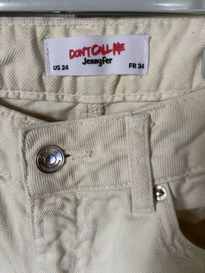 Jeans straight 100% coton beige imprimé 34 Jennyfer Très bon état sauf une tâche légère sous une poche, voir photo La ceinture mesure à plat 33 cm Longueur milieu devant à la braguette 27,5 cm Longueur entre jambe 75,5 cm Largeur à plat bas des jambes 22 cm