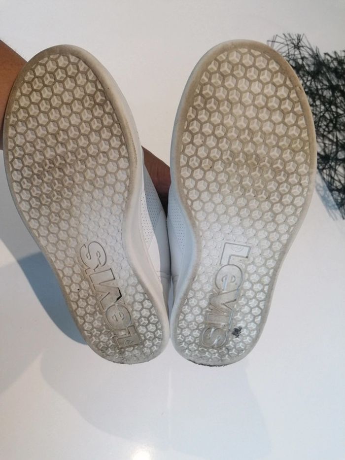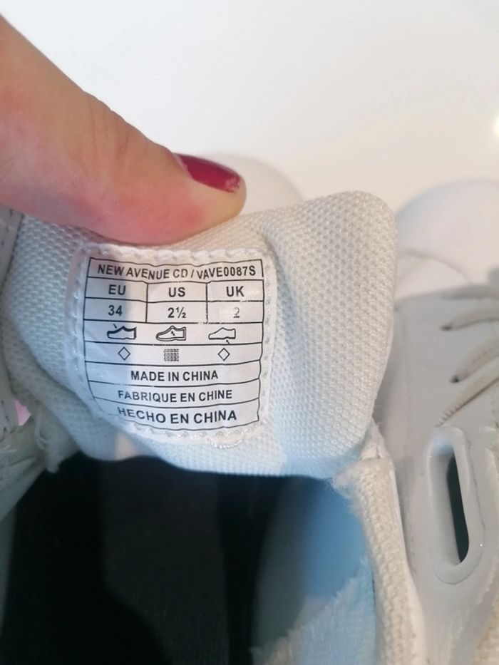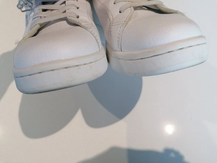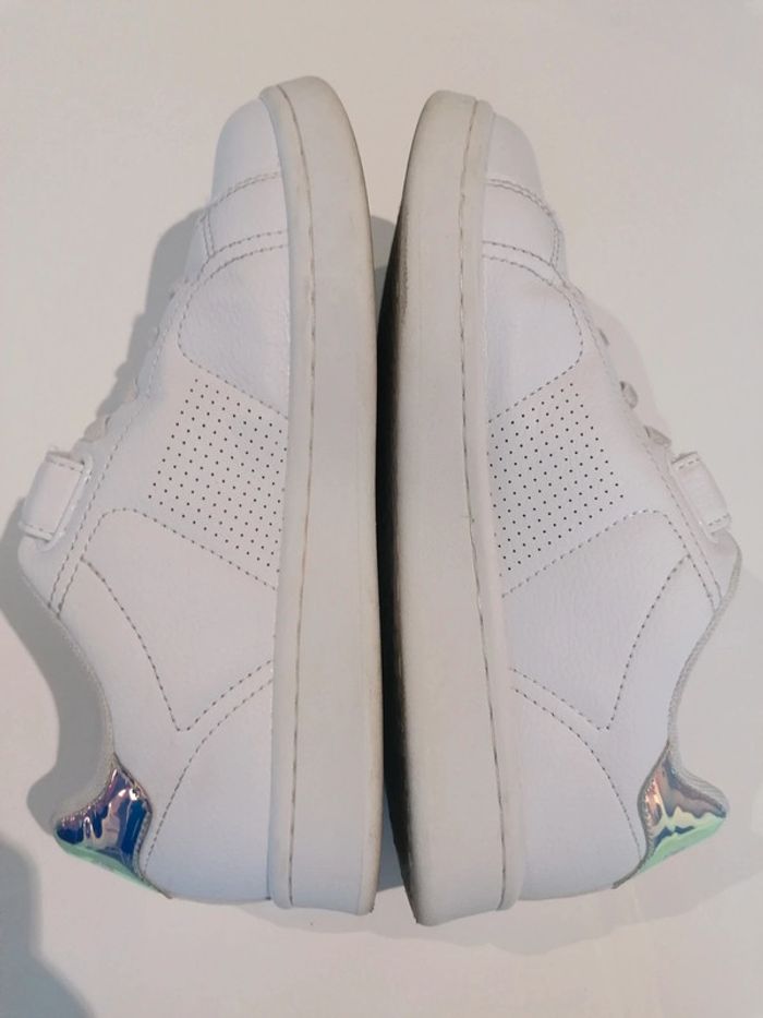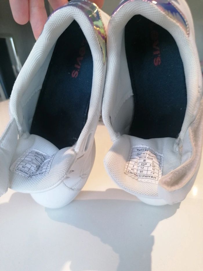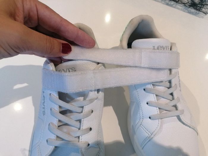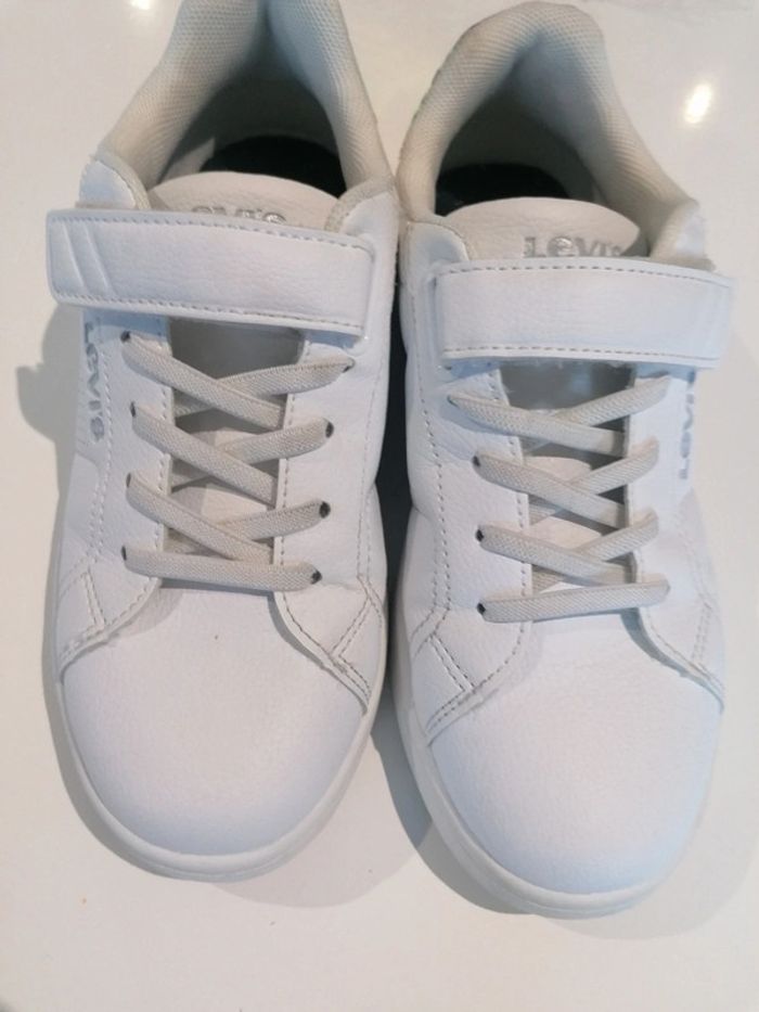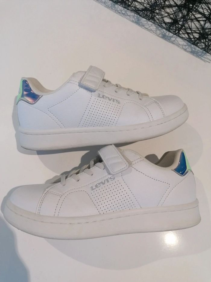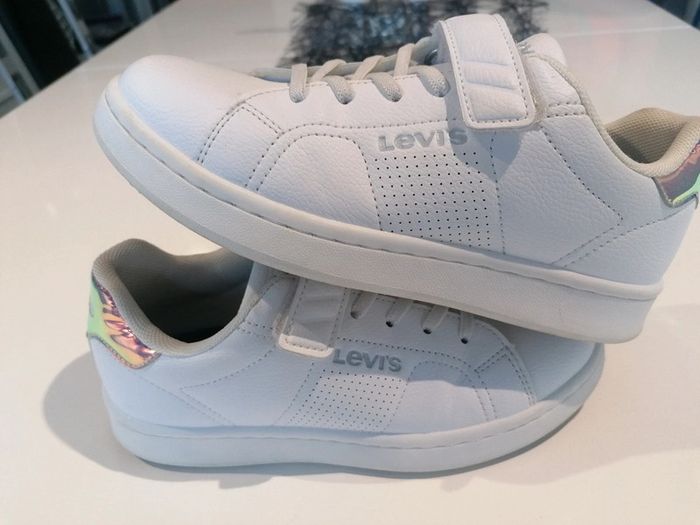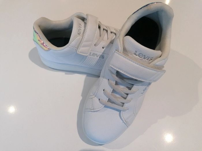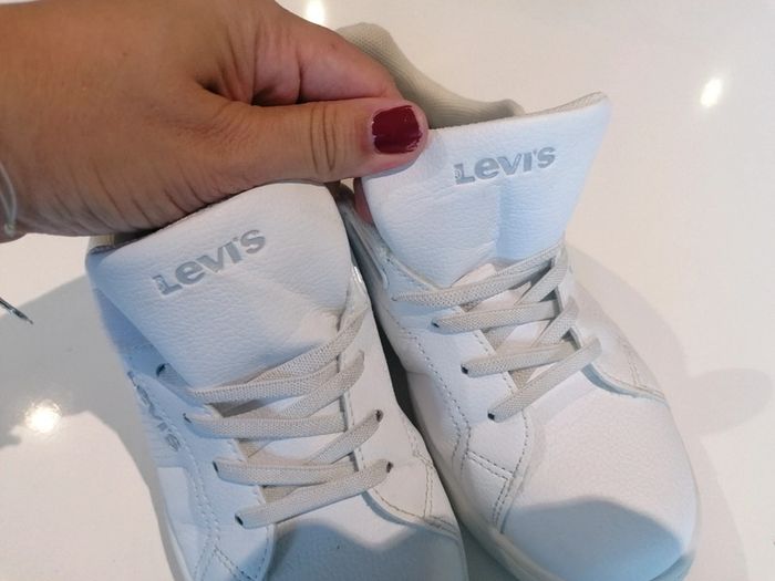 Paire de basket Levi's Fille Taille 34 Offert pour Noël. Mais déjà trop petite 😔 Acheter à Intersport 70 euro environ Mise 3 ou 4 fois max Proche du neuf On été laver Bien blanche Pas d accro ni tâches 🤩 Faciles à enfiler Lacets élastique juste scratch