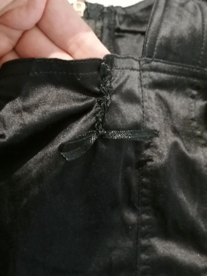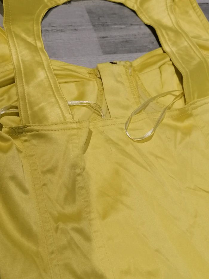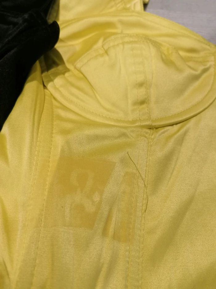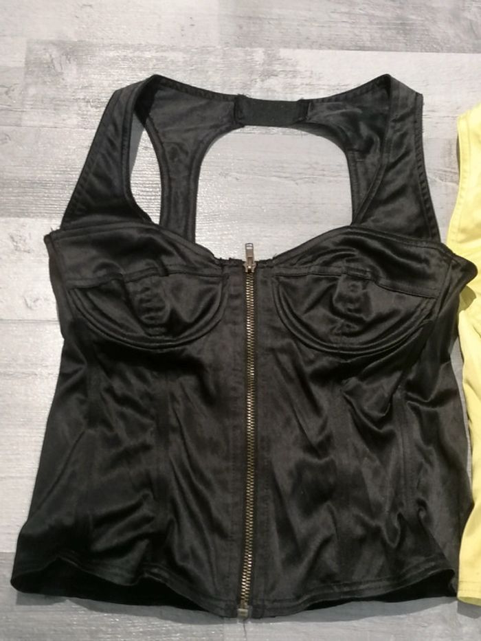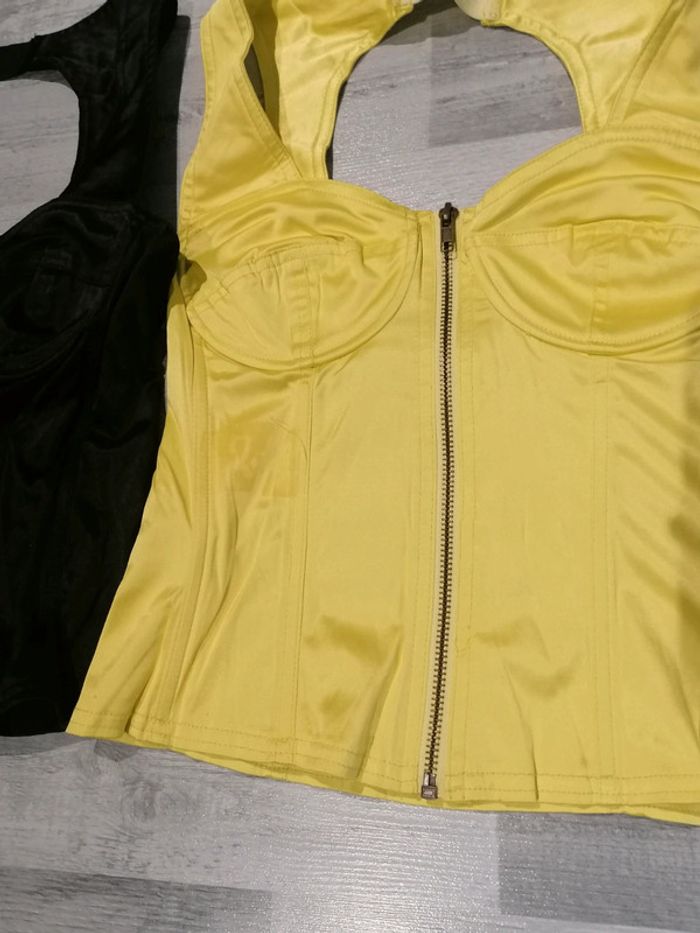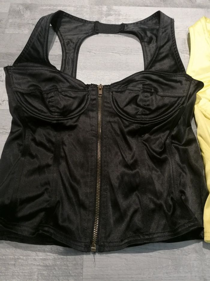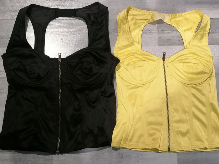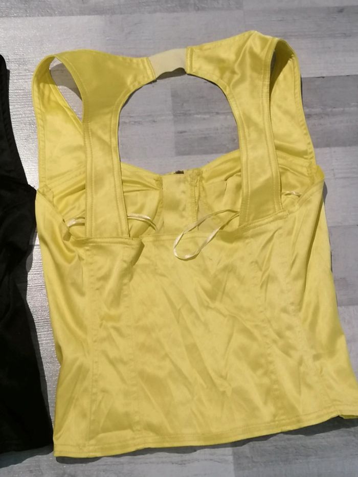 Lot 2 bustiers Un noir ( un peu recousu au dos) Un jaune flashy ( marqué 2) Les défauts sont en photos Élastique au niveau du dos Fermeture éclair devant Maintien petite poitrine * articles pas à moi Taille peut être 34 ou 36