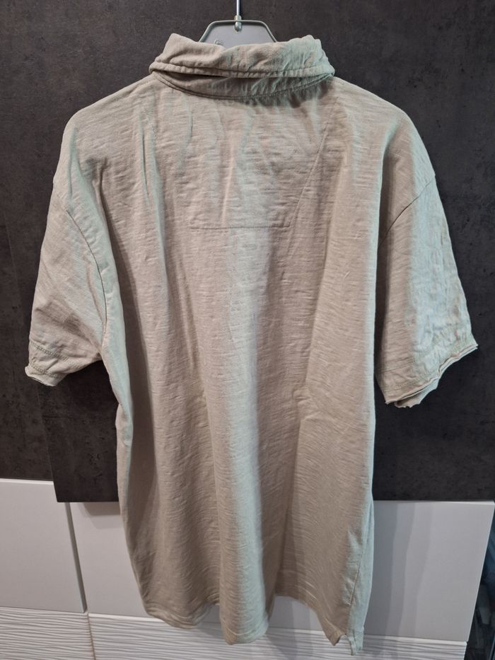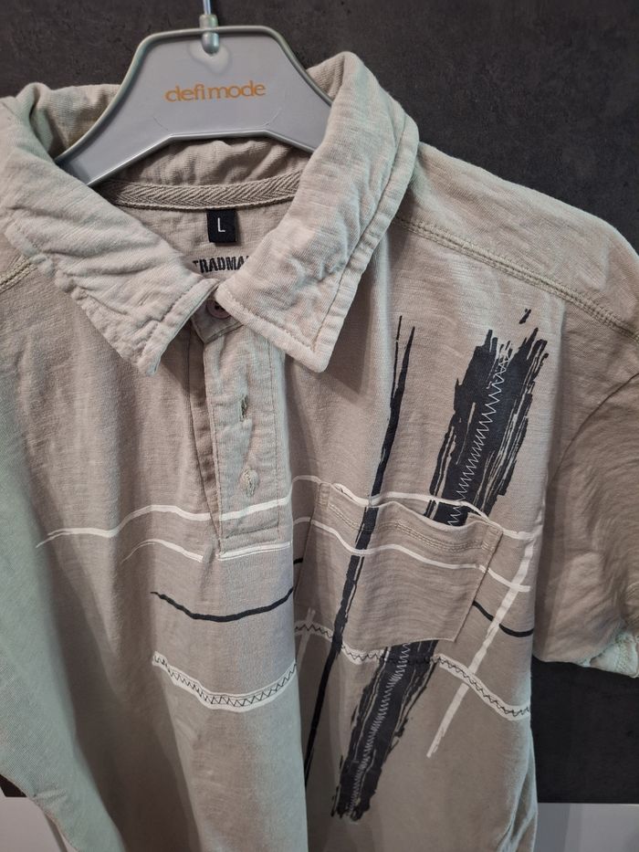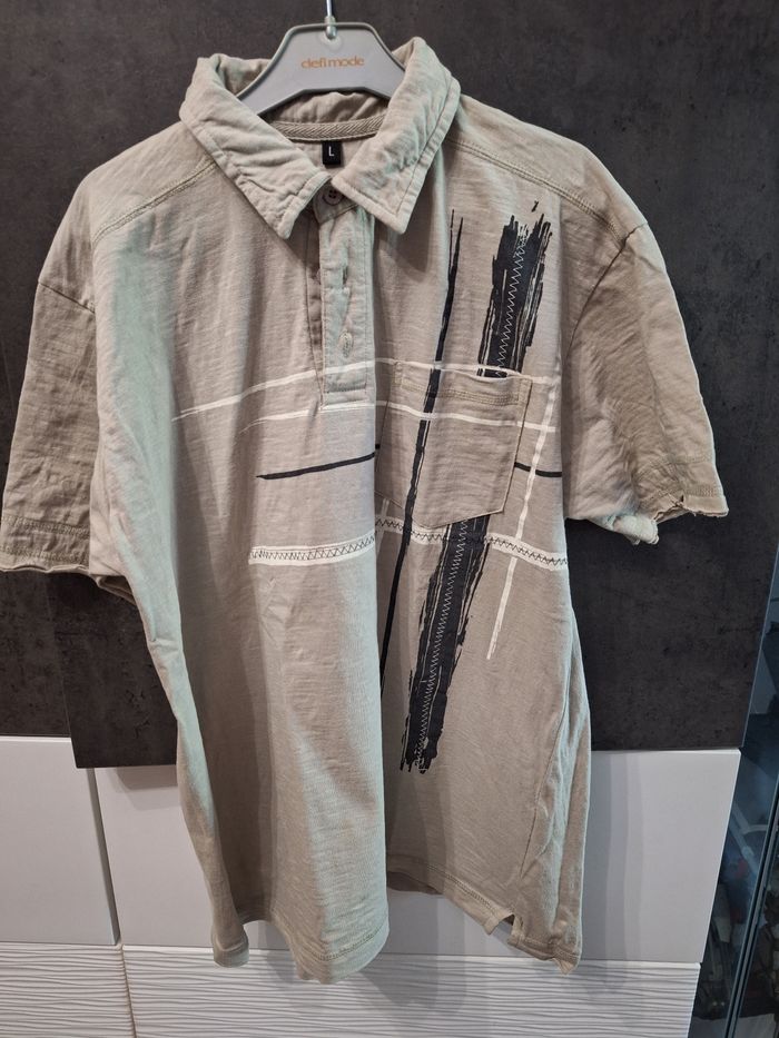 Joli polo manches courtes beige, motifs graphiques blanc et noir devant, 1 poche poitrine, col 3 boutons, marque H & Lewis, taille L, porté mais en très bon état