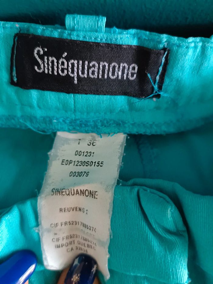 Pantacourt Couleur turquoise Taille 36 Marque sinequanone Traces d'usure il y a des petites tâches sur un côté. Je n'ai pas pu les faire partir je n'ai pas de détachant mais ça doit partir je pense. Je ne rembourse pas ni n'échange. Vous achetez ce que vous voyez sur les photos.