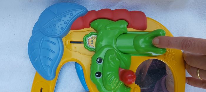 .Tableau d'éveil Un miroir Un éléphant rose à appuyer dessus Les boucles jaunes et blanches se tournent Le perroquet peut être glissé La pâte du crocodile peut être tirée La tortue verte peut être tournée #carineddijeux