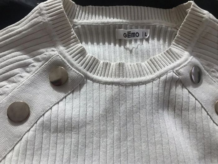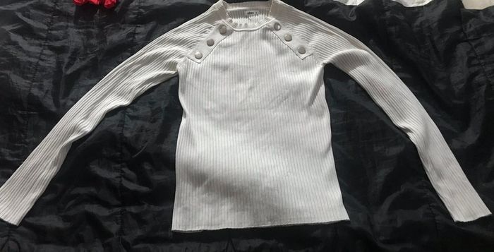Pull Taille L Couleur blanc crème Très bon état comme neuf Porté 2 fois Pas de trou Voir photo Réduction activée 🛍🛍🛍