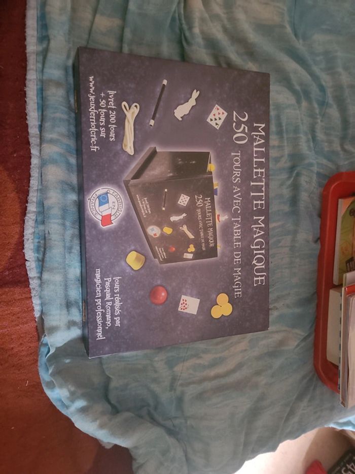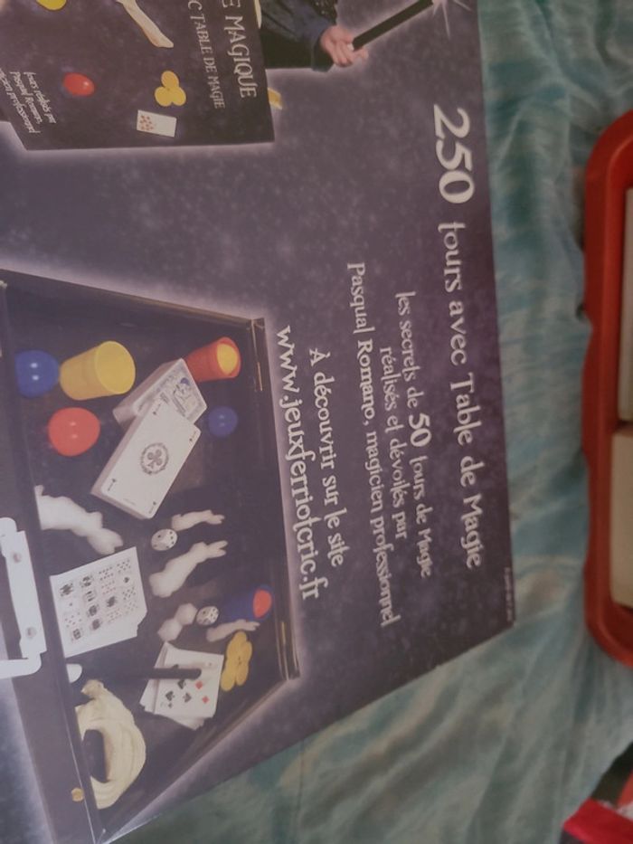 Mallette Magique 250 Tours, des 7 ans Description du produit Mallette avec table de magie - livret 200 Tours de magie + 50 Tours sur.jeuxferriotcric.fr - Tours réalisés pas Pasqual Romano, magicien professionnel Avertissement De Sûreté Danger d'étouffement - Petites pièces Contenu du coffret Jeu de 54 cartes ; jeu de 5 cartes magie ; jeu de cartes magie ; cordelette ; baguette ; boite magie ; dés ; sphères ; gobelets ; lapins ; jetons ; table de magie ; divers accessoires de magie ; livret descriptif de 200 tours de magie + code pour l'accès aux 50 tours sur leurs site Web