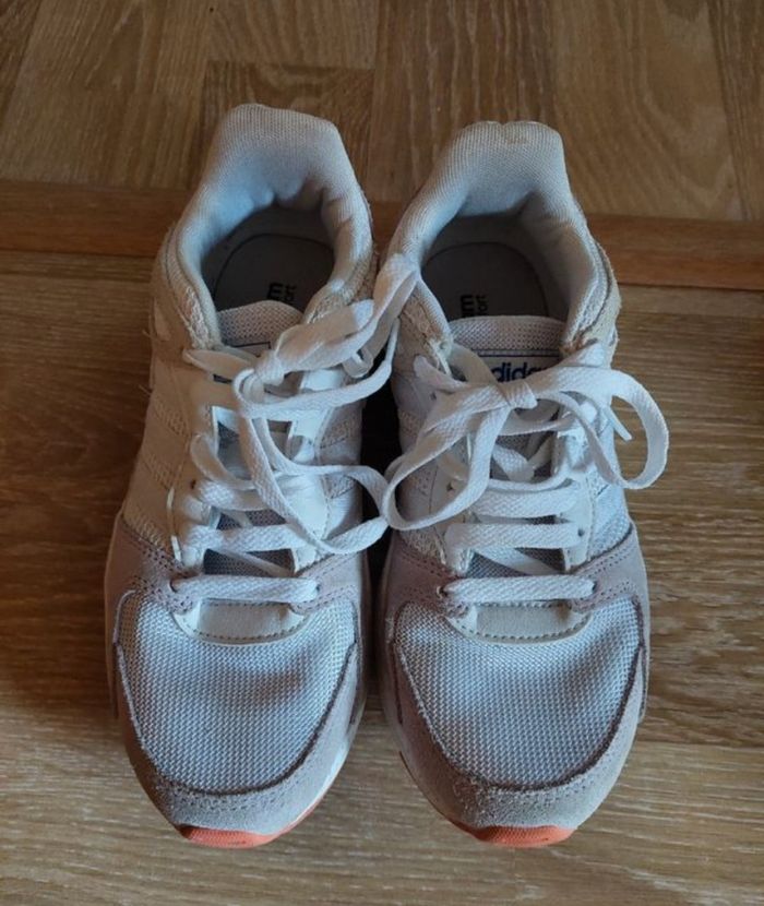Véritable baskets de marque Adidas Pointure 37 1/3 Peu utilisées Légèrement sales par endroit notamment sur le devant des chaussures, le contrefort du talon, la semelle extérieure est blanche Lacets propres Achetées 80e, vendues 45 euros Envoi de préférence par mondial relay En synthétique Idéales pour le sport mais également pour le quotidien Confortables Couleurs claires / pastels Non trouées seulement légèrement sales La trace du pied sur la semelle intérieure n'est pas tellement visible preuve qu'elles n'ont pas beaucoup servies Vendues sans boîtes mais sera envoyée dans un carton