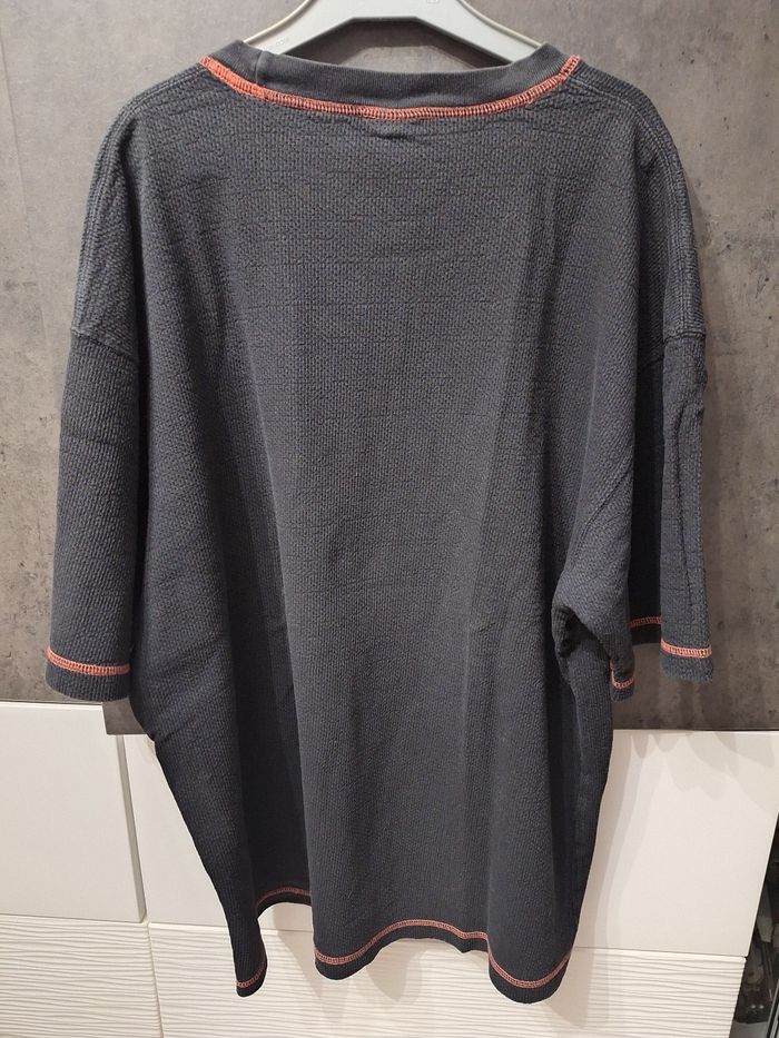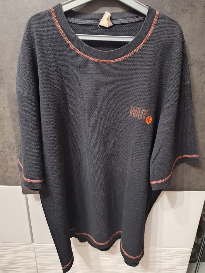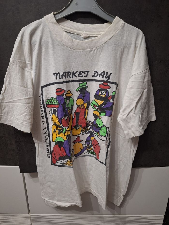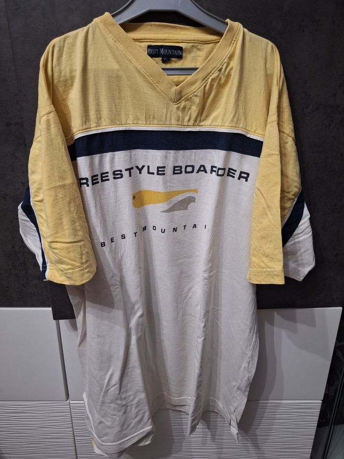 Lot de 4 t-shirts manches courtes : - 1 noir uni sans marque, - 1 blanc et jaune inscriptions devant, col V, marque Best Mountain, - 1 noir plus épais surpiqûres orange, inscriptions poitrine, sans marque, - 1 blanc dessin et inscriptions devant, sans marque Le tout taille XL, porté mais en bon état. Polo rayé bleu et blanc en cadeau car un peu tâché en bas