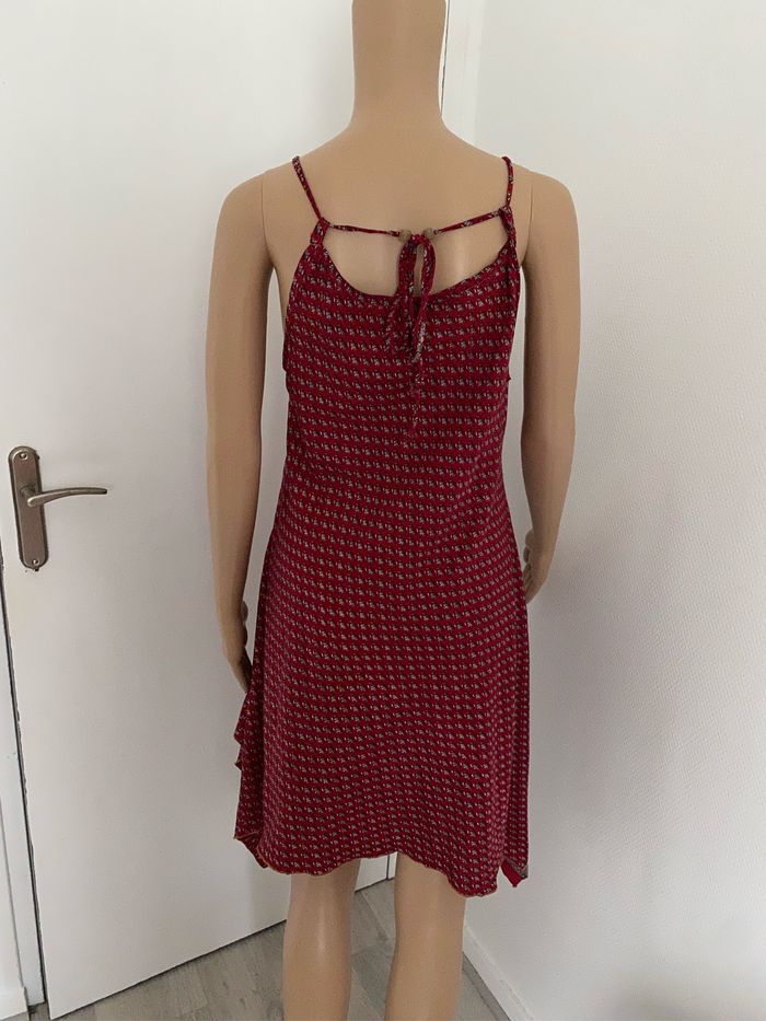 Jolie robe coupe asymétrique. Elle s’ajuste comme on le souhaite grâce aux liens dans le dos. Convient du 36 au 42. Contient de la soie.
