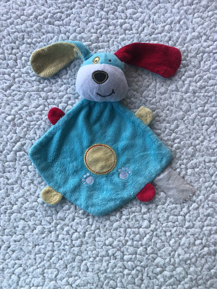 Doudou plat losange chien bleu jaune rouge Des empreintes en broderie +/- 22cm Kimbaloo Occasion en très bon état Vous achetez le doudou que vous voyez sur la photo