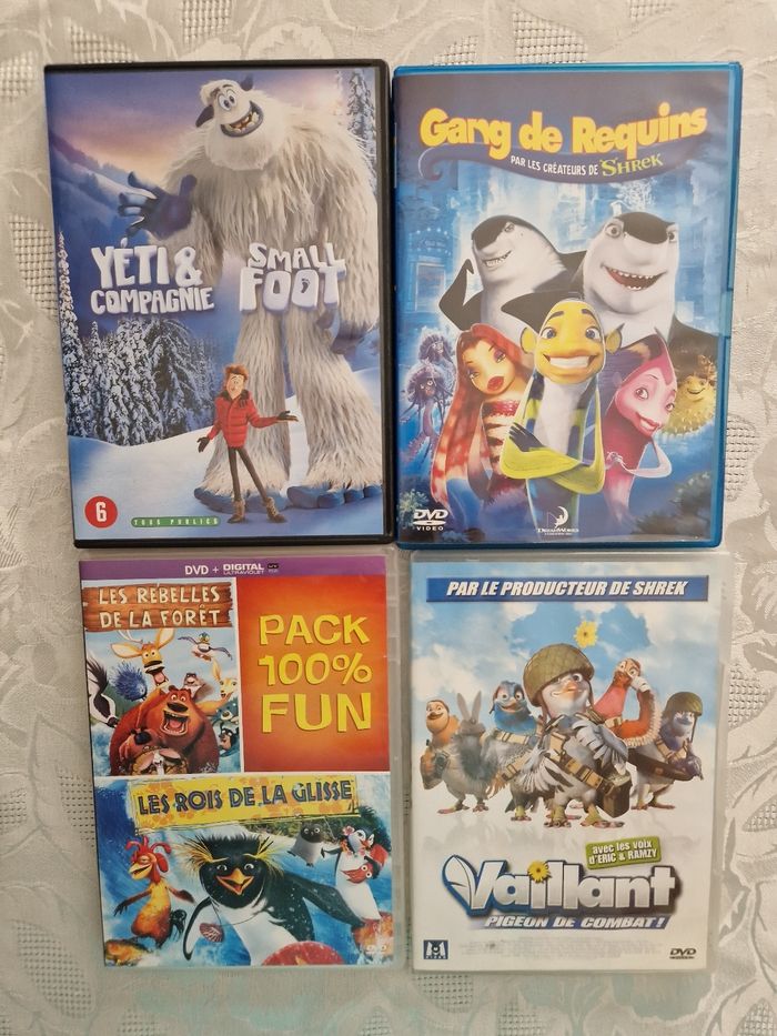Vends 4 dvd comprenant gang des requins , yeti compagnie et small foot, Vaillant pigeon de combat, les rois de la glisse et les rebelles de la forêt en très bon état.