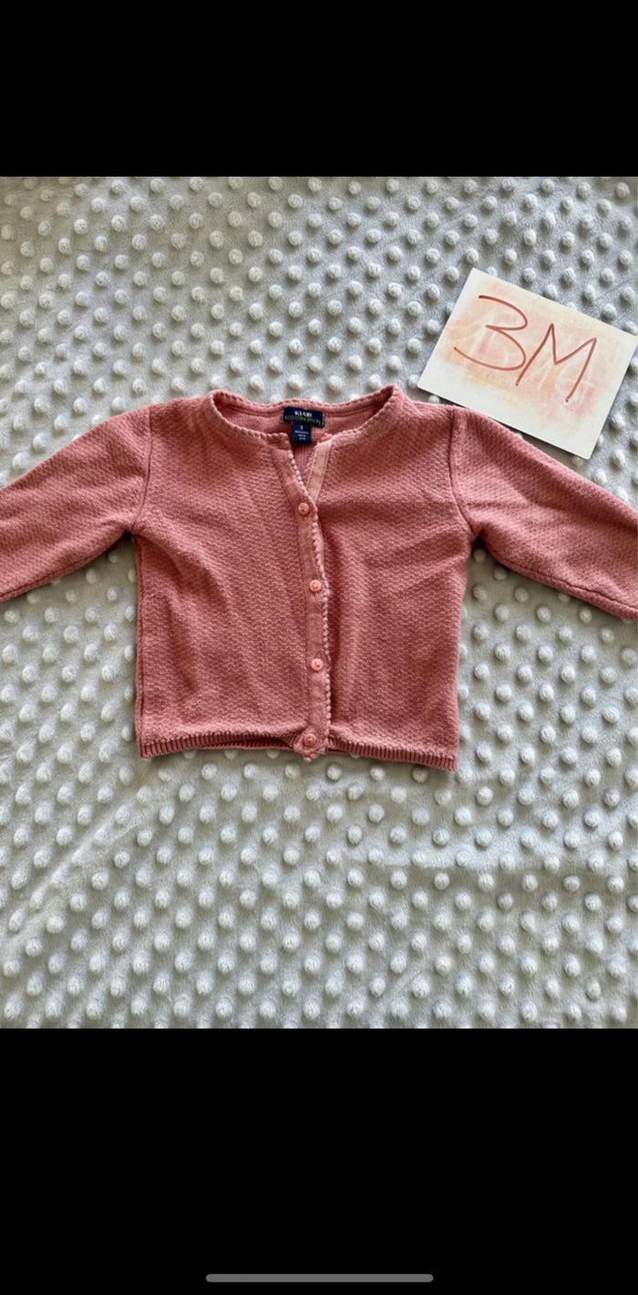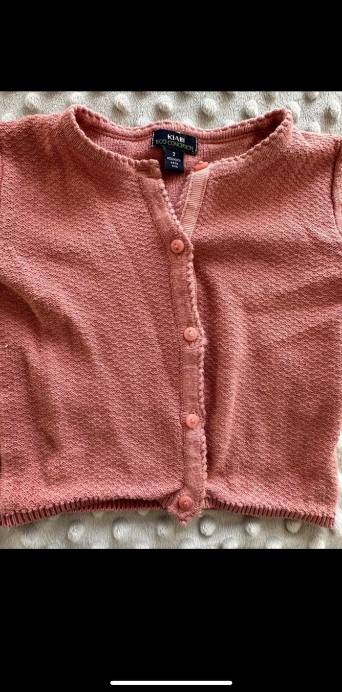 Gilet en maille rose taille 3 mois de la marque kiabi. Parfait état, aucun défaut. La maille est bien élastique, facile à enfiler.