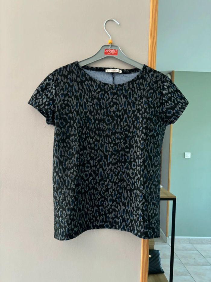 T shirt noir et bleu à motifs léopards - photo numéro 1