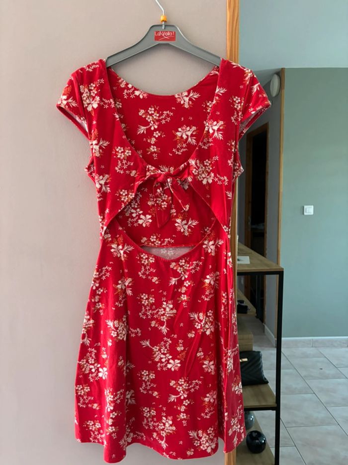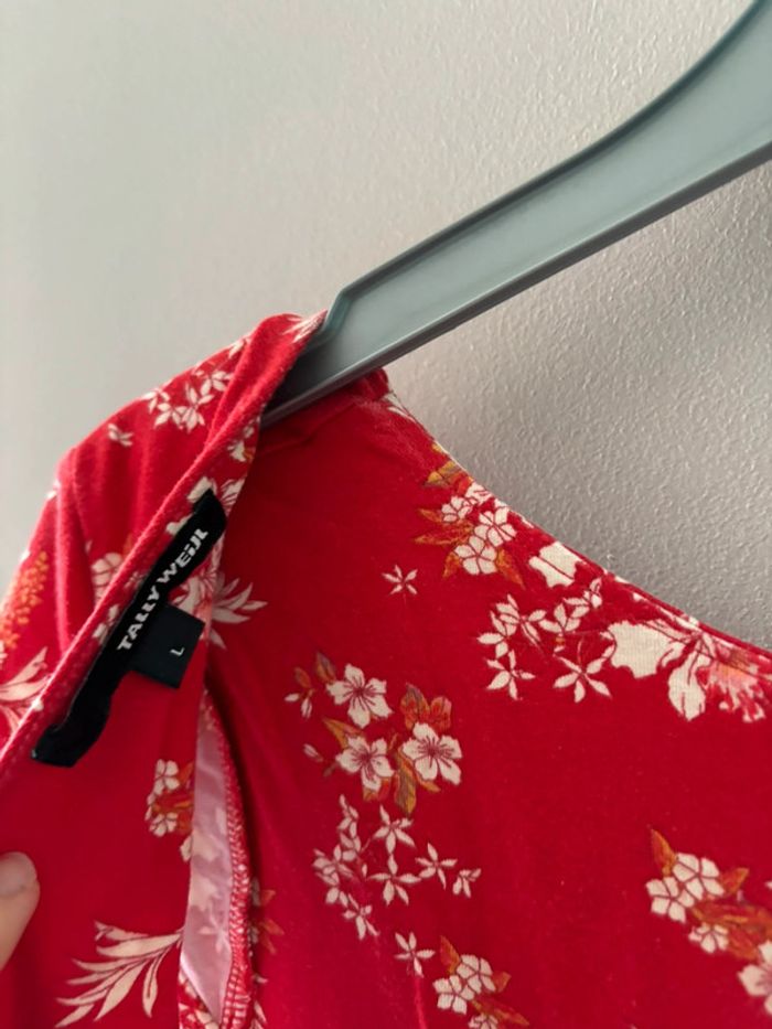 Robe à manches courtes rouge à fleurs Près du corps en haut et évasée en bas Ouverture dans le dos Tally weijl taille L En très bon état