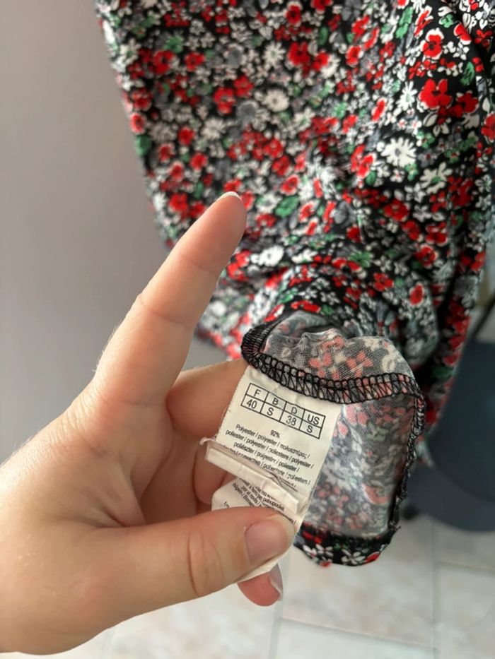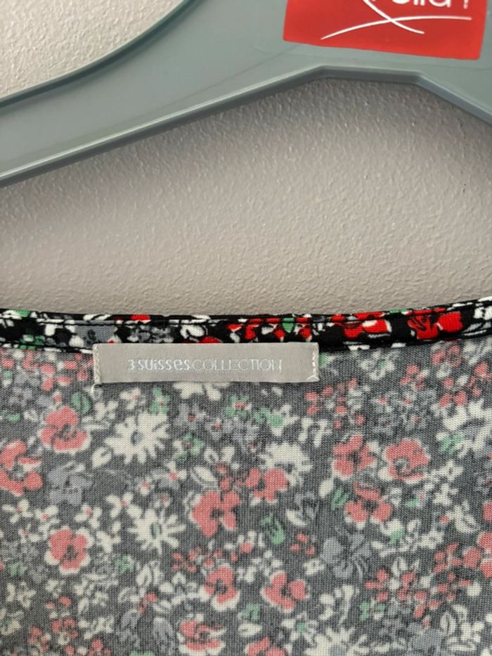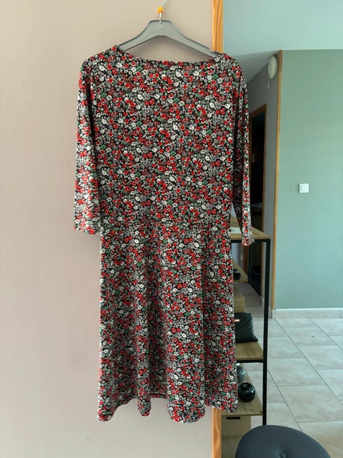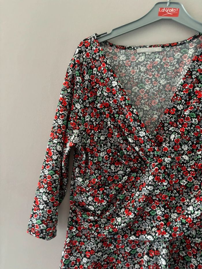 Robe manches 3/4 près du corps à fleurs rouges noires et blanches Drapée 3 suisses taille 40 En très bon état