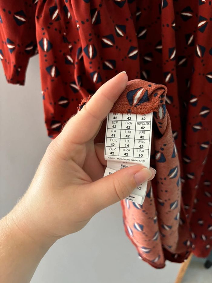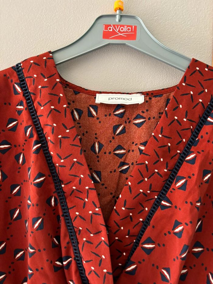 Robe décolleté croisée bordeaux à motifs bleu marine Élastique à la taille Promod taille 42 En très bon état Arrivé en dessous du genou
