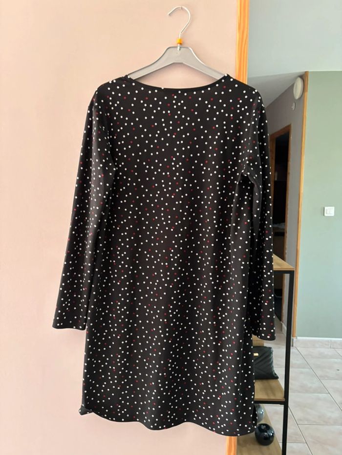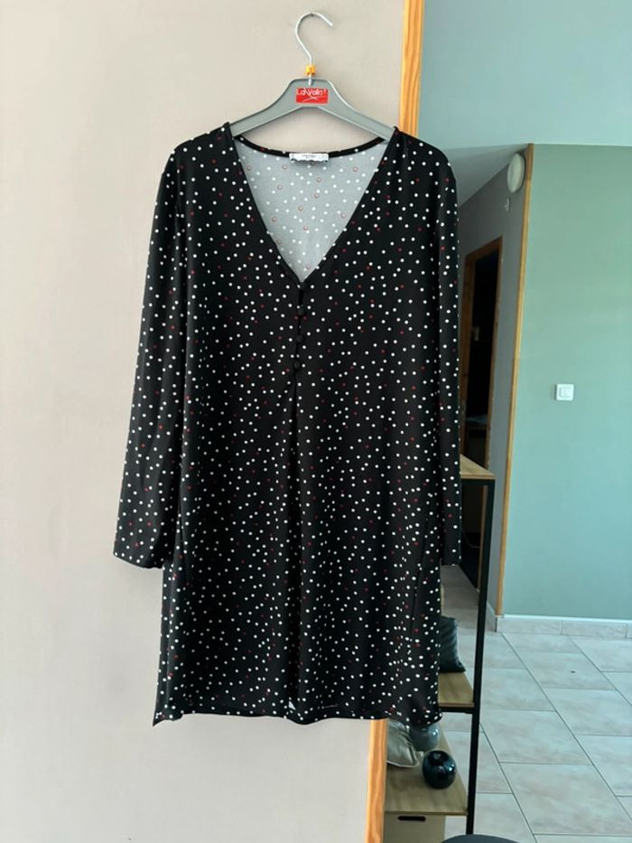 Robe droite à manches longues col V noir avec pois bordeaux et blancs - photo numéro 1