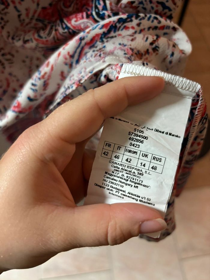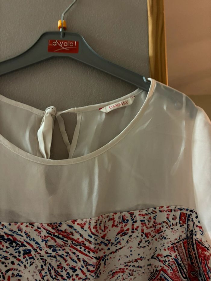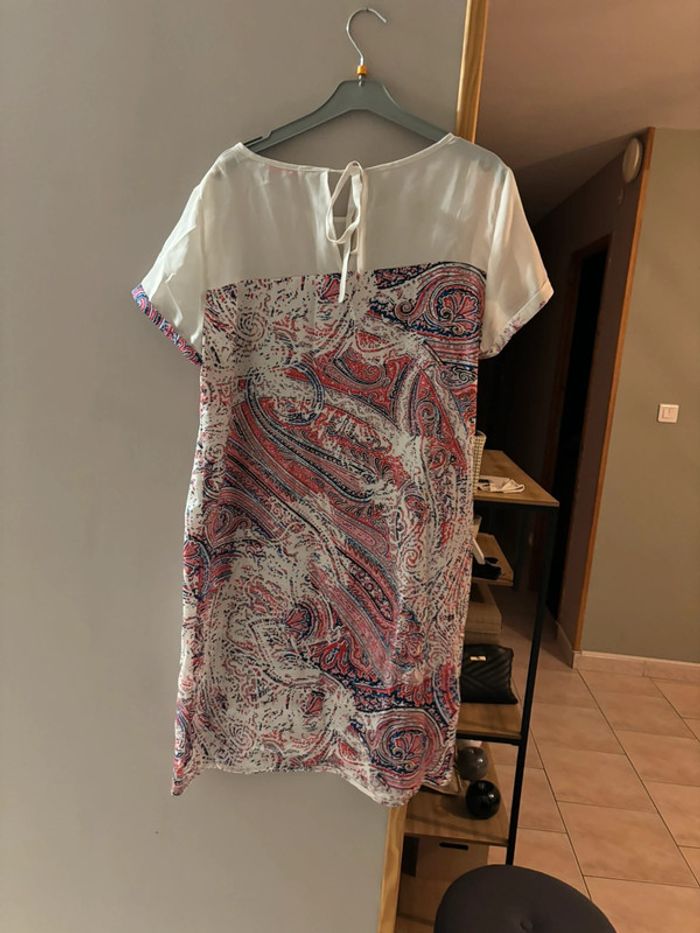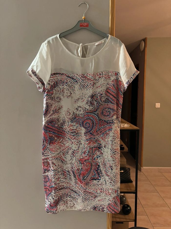Robe coupe droite blanc et violette à motifs colorés Manches courtes Camaïeu taille 42 En très bon état