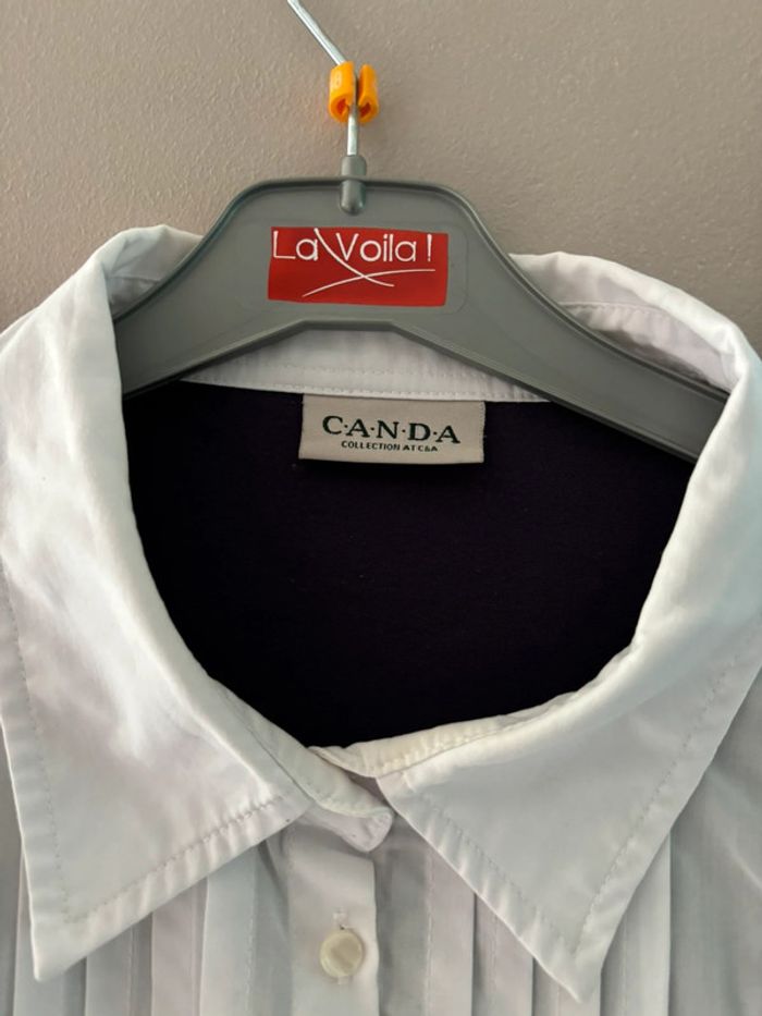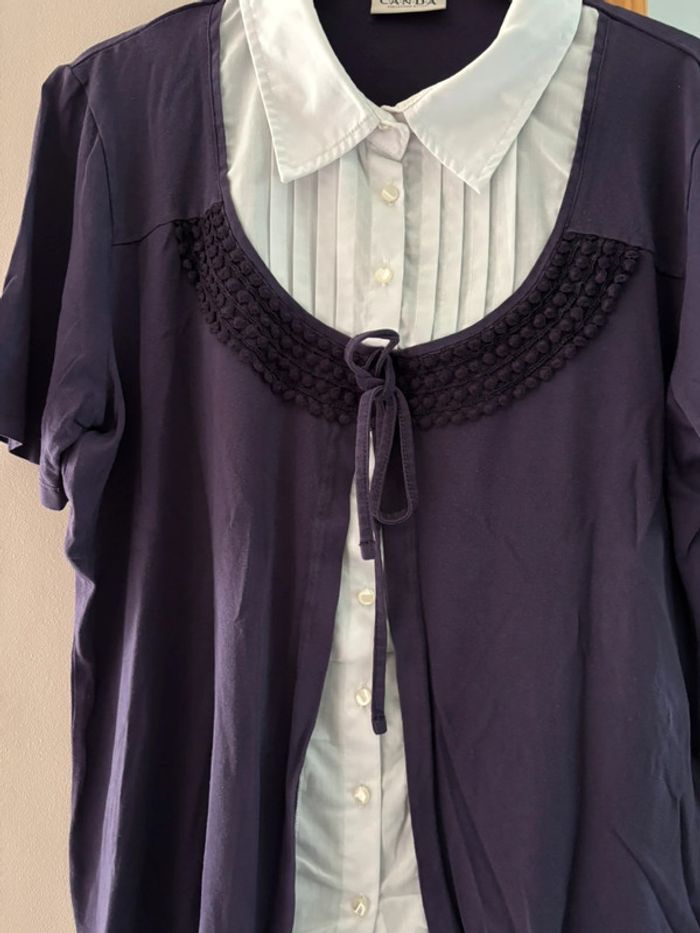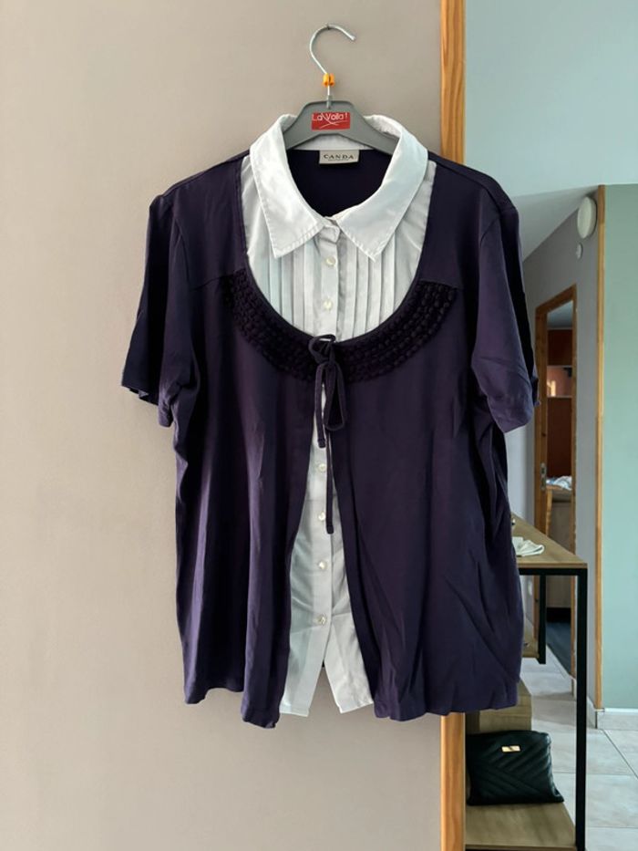 Blouse vintage manches courtes Chemisier blanc avec doublure violet à nouer Canda taille 42 En très bon état