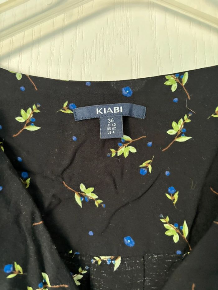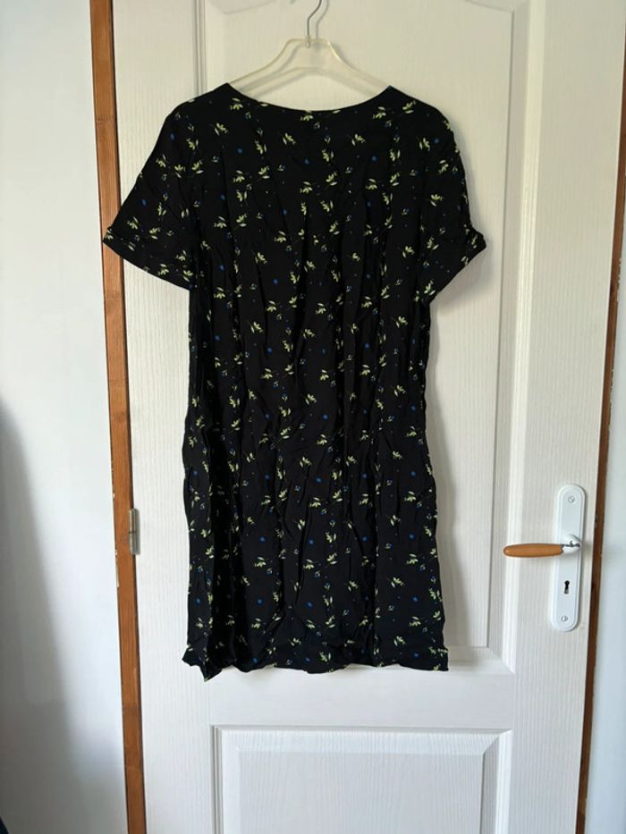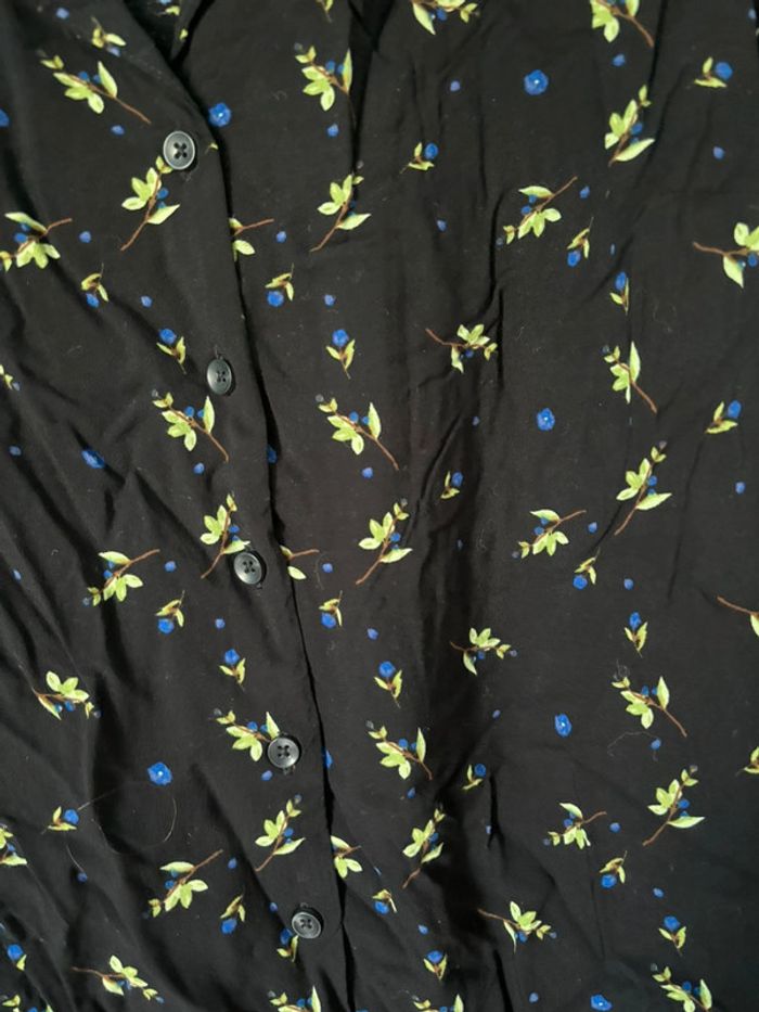 Robe chemise à manches courtes noire à motifs feuilles vertes et bleues Col V Kiabi taille 36 En très bon état