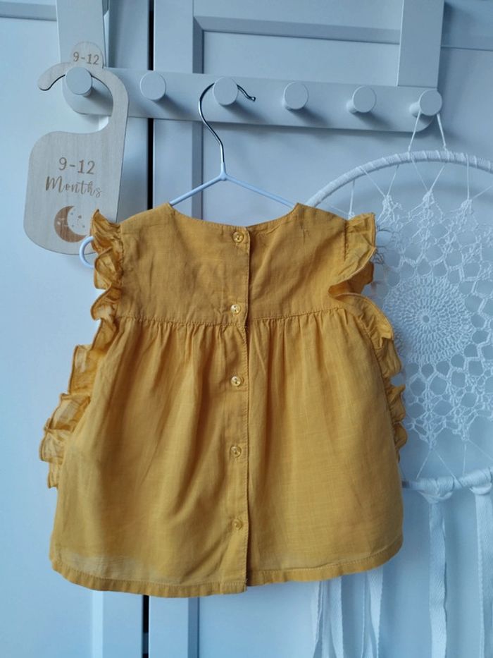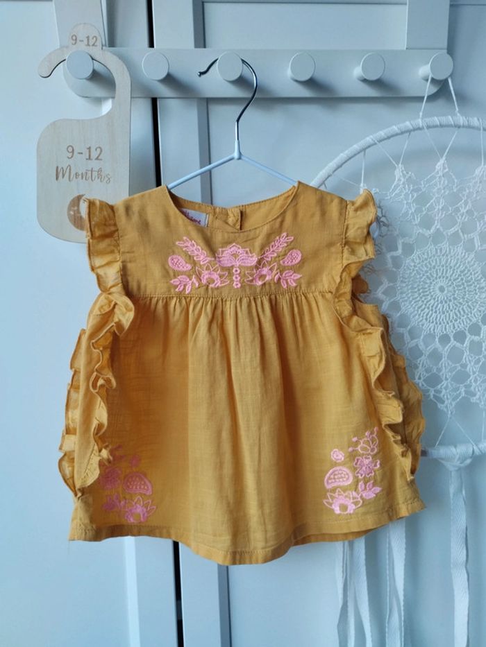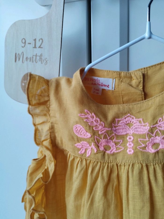 🍒Article : T-shirt sans manches avec de volants, boutonné a l'arrière couleur moutarde avec de motif brodés rose 🫐État : très bon état 🍉 Marque: Du pareil au même 📏Taille : 9 mois 🪡Matière et mesures: (sur demande) 🚭Maison NON fumeur 🍓Pas de surprise caché, vous recevrez ce que vous commandez, tout les défauts son dans les photos ou dans le descriptif 📦Envoie rapide et soigné, je fais des envois 2 ou 3 fois par semaine, du mardi au samedi ❔Si vous avez des questions n'hésitez pas à les poser je répondrai dans les plus brefs délais 🧺Tout les vêtements sont lavés, sèches a l'aire libre pas de sèche linge, repassé, puis stocke a l'abri de l'humidité. Pour trouver plus d'articles dans cette catégorie /taille cliquez sur le lien ci-dessous #ecirdney_9mois