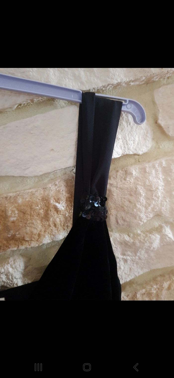 Jolie robe noire sans manches. En velours sur le haut. Et tissu léger sur le bas. Avec strass.. lien à l arrière. Fermeture éclair sur le côté