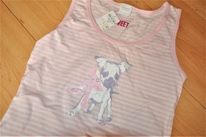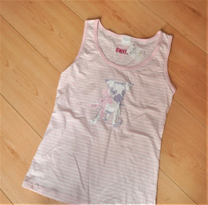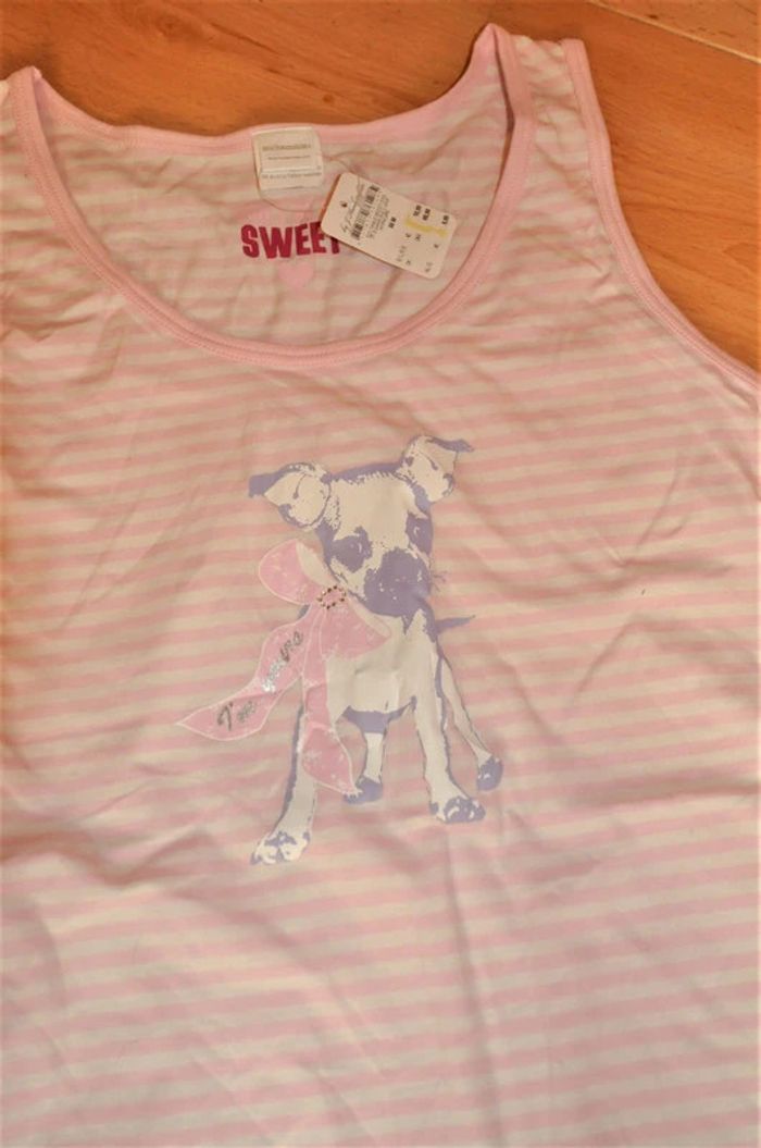 top sans manche en coton ligné rose et blanc avec adorable motif chiot, neuf avec étiquette #valhaefemmeM