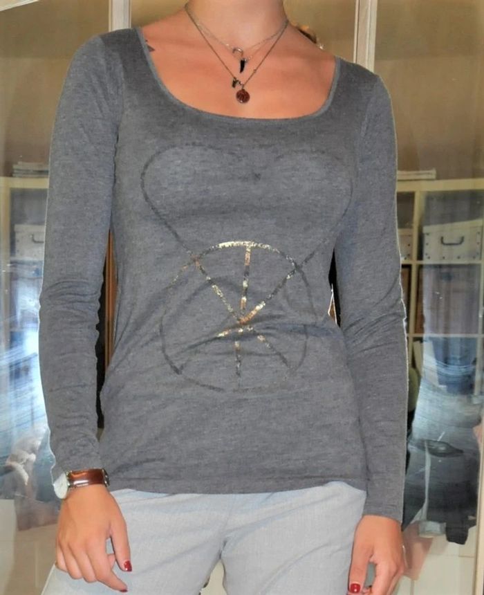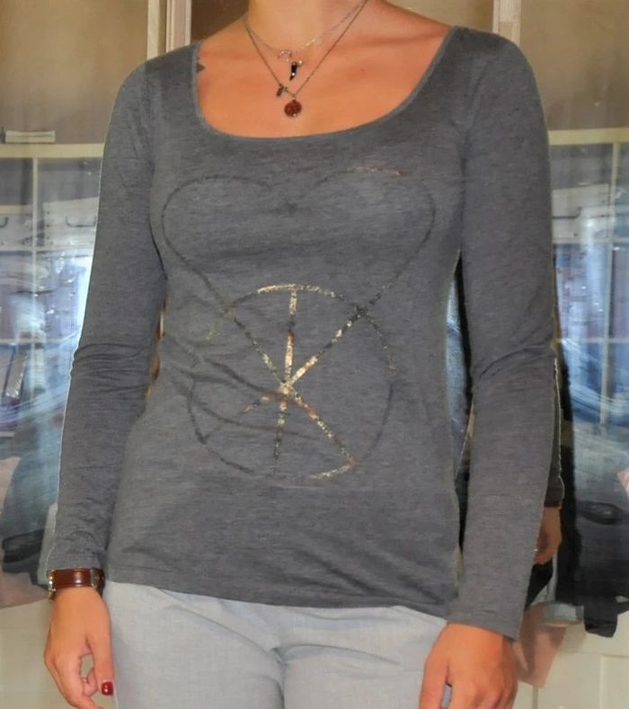 Esprit T shirt gris décolleté arrondi, tracé motif doré taille allemande xs, taille française S Autres articles en vente de cette taille dans mon dressing, n hésitez pas à consulter mes ventes pour ne payer qu'une fois les frais de port et les rentabiliser
