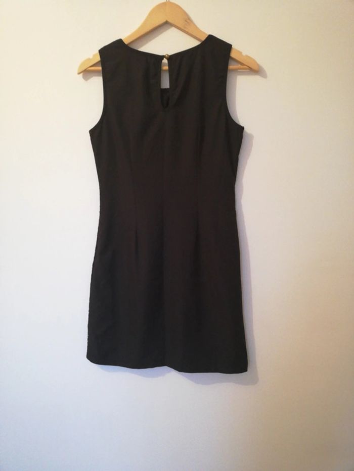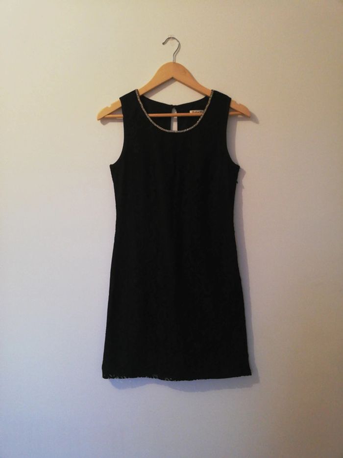 Robe noire Dentelle mais pas transparente car doublure Fermeture éclair sur le côté. Bouton dans le dos. Détail doré au col Parfait état. Elle m'arrive un peu au-dessus du genou (1m73) Taille S mais convient aussi pour du M #babywrapmum