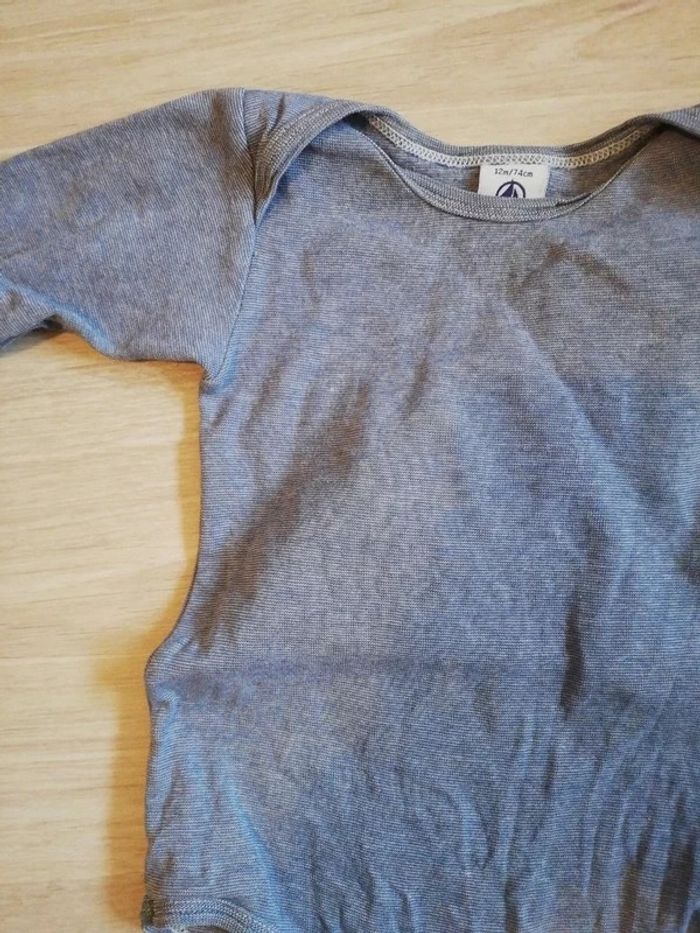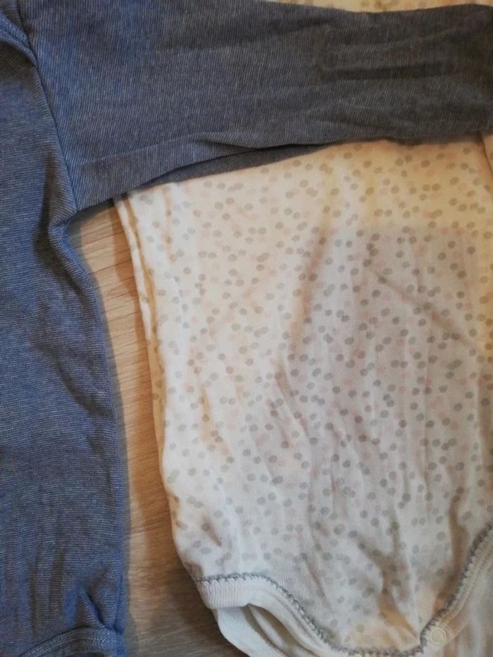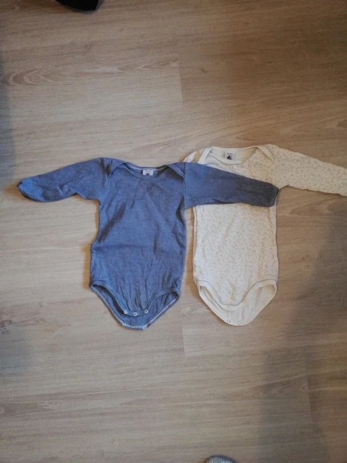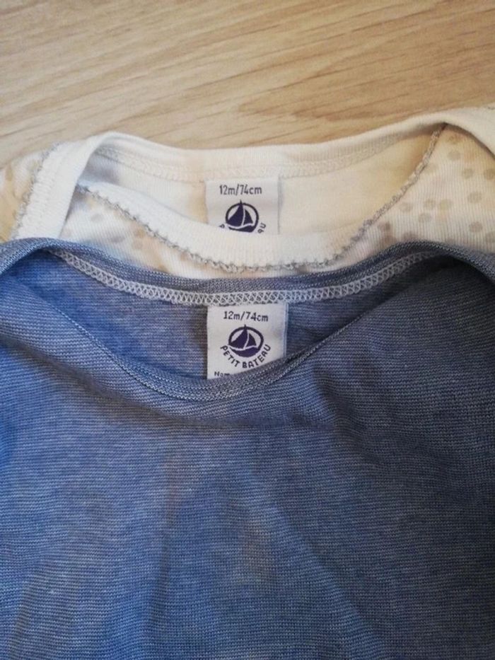 Manches longues Mixte Petit Bateau 12mois L'un bleu fines rayures blanches. Légère tâche à l'arrière du bleu (voir photo) L'autre blanc avec des pois gris et rose pâle #babywrap12mois