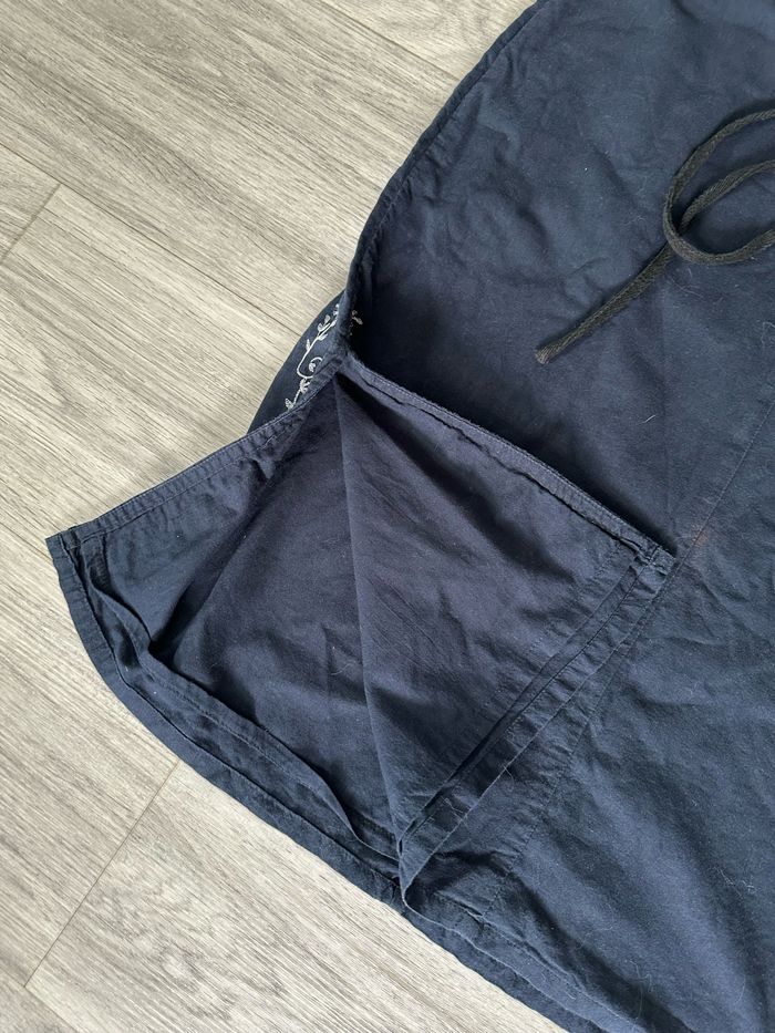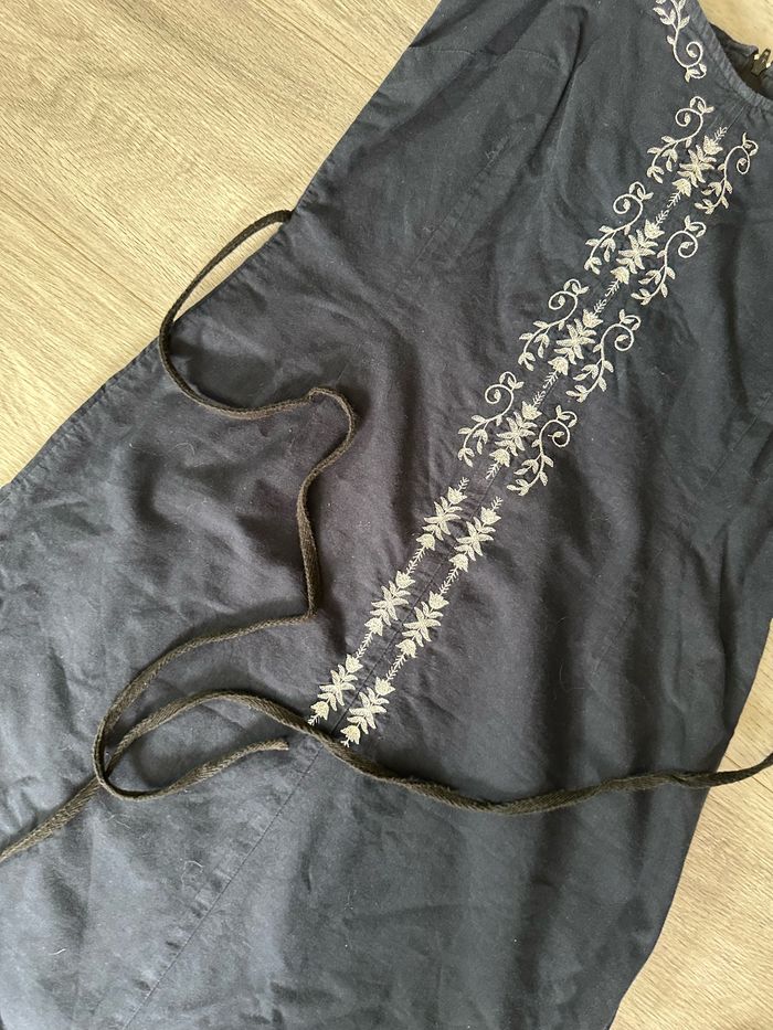 Robe - Excellent état - Taille 40 équivalent L - Bleue marine, blanche et noire - Zip dans le dos - Fines bretelles - Etam Vintage, années 90’ - Liens à la taille à nouer sur l’avant ou sur l’arrière - Détails broderies, brodés - 100% Coton Dimensions: - 44cm niveau aisselle - 111cm de long