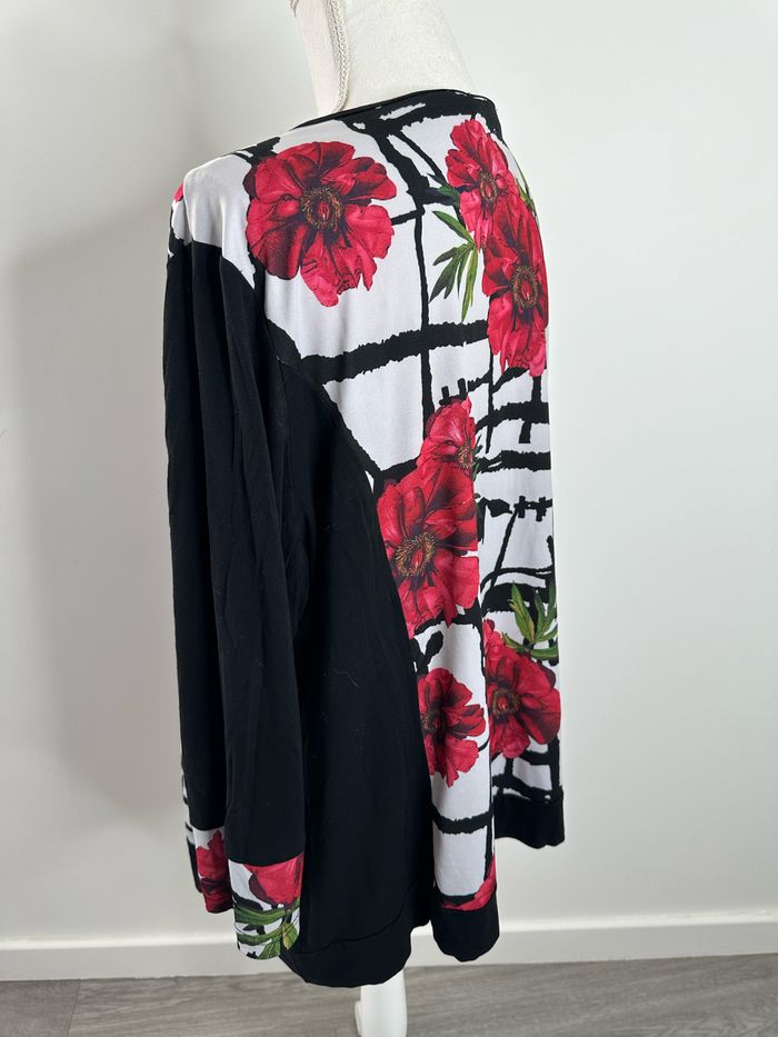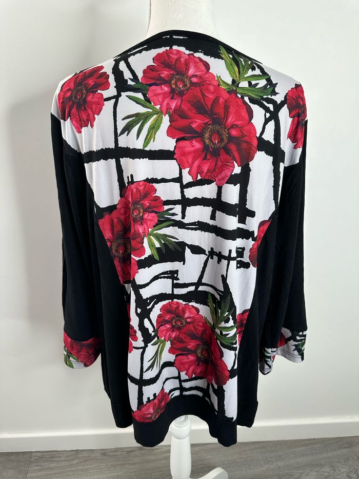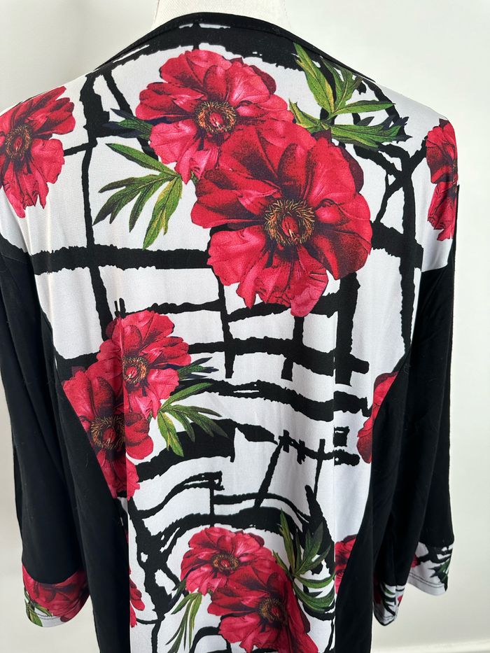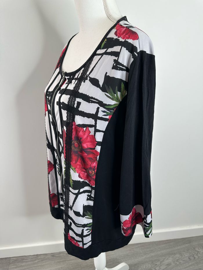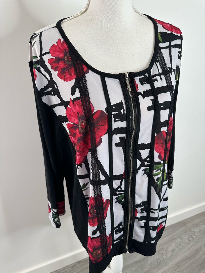Blouse cardigan - Excellent état - Taille 44 équivalent XXL - Manches 3/4 - Coupe oversize - Blanche, noire, rouge et verte - À porter en blouse ou en cardigan - Long zip à l’avant - Imprimés fleurs - Polyester et spandex - Tissus fluide hyper stretch