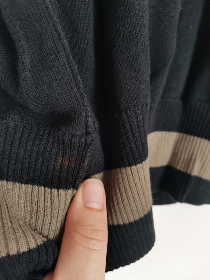 Pull celio taille L. Couleur noir uni, l'effet est dû à mon appareil photo. Bon état car présente une tache en bas sur le côté gauche, voir photo. #emilie77127homme