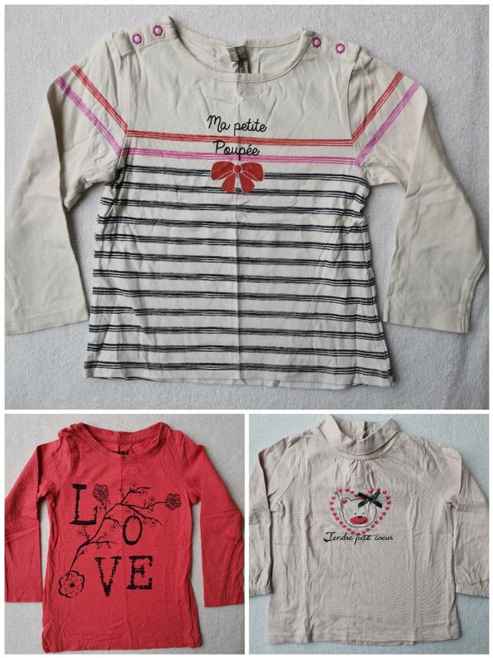 Lot de 3 t shirts manches longues 24 mois ou 2 ans comprenant : 1 T shirt manches longues de orchestra en 23 mois ou 86 cm. 2 pressions de chaque côté des épaules pour passage de la tête. 1 t shirt manches longues de orchestra en 2 ans ou 92 cm, rose à motif bleu marine. 1T shirt manches longues et col roulé de mes petits cailloux en 24 mois ou 86 cm. #emilie77127fille2ans #emilie77127fille18mois
