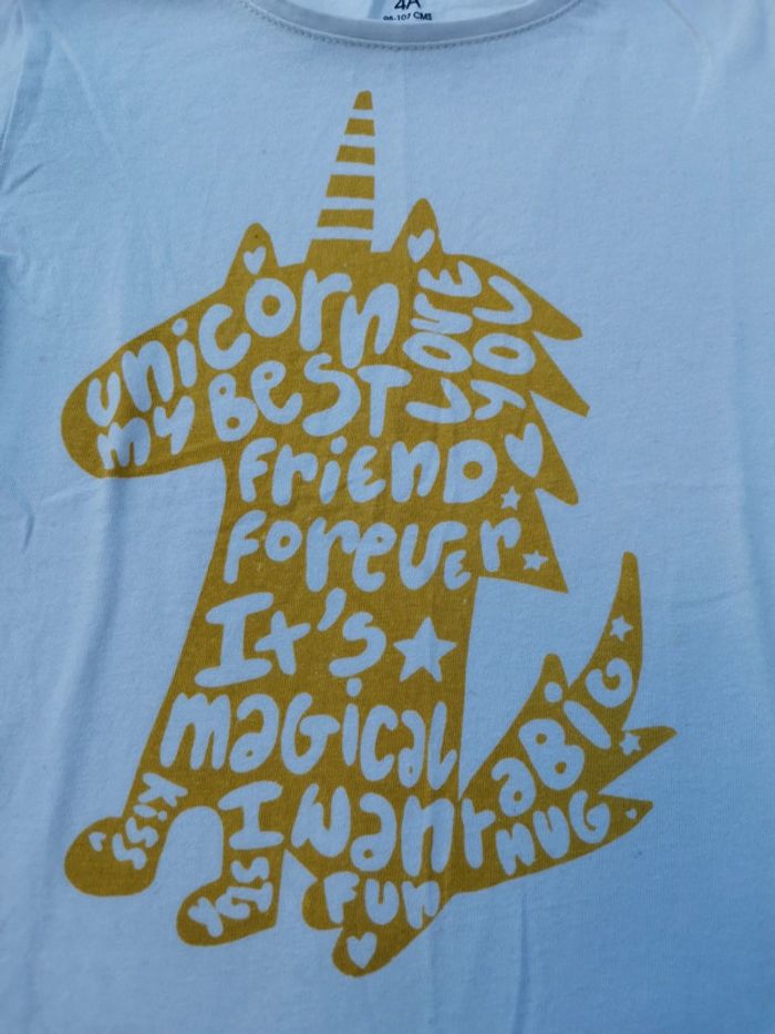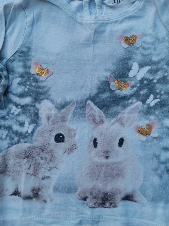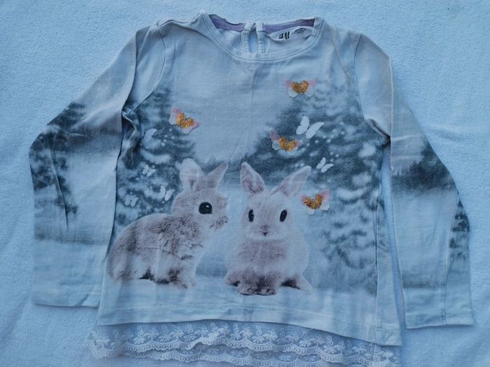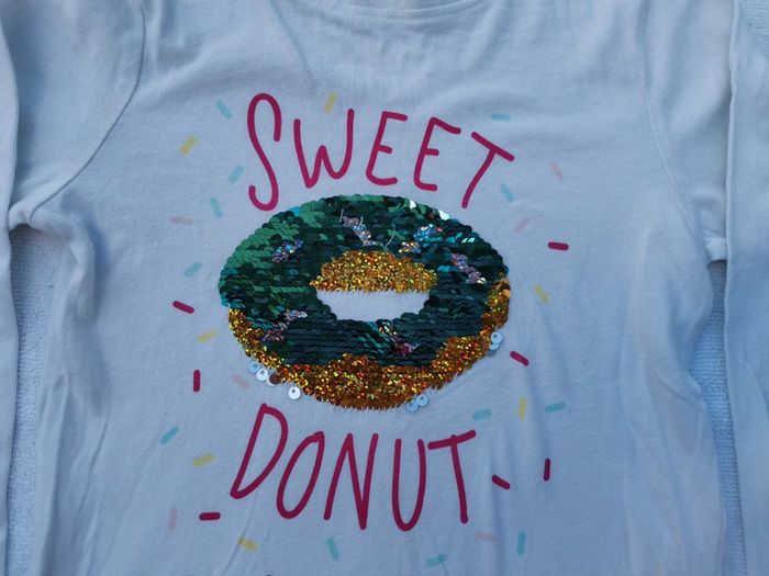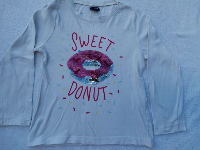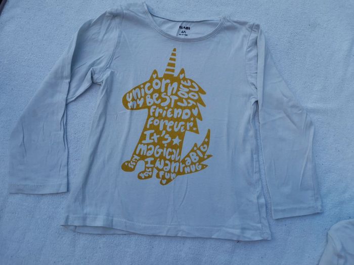 Lot de 3 t shirt manches longues 4 ans : - 1 H&M avec motif petits lapins et papillons sequins dorés. - 1 kiabi blanc à sequins réversibles donuts - 1 kiabi blanc à motif licorne moutarde : 1 tâche au niveau du coude gauche, voir photos. #emilie77127fille4ans #licorne #lapin #papillon
