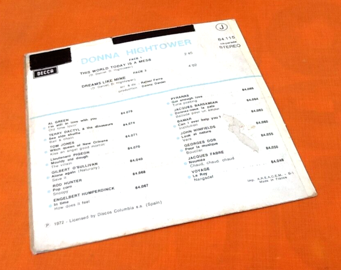 (article vendu en l' état, état d' usage, micro rayures qui n' empêchent l' écoute du vinyle, voir toutes les photos). Vinyle 45 tours Donna Hightower This world today is a mess (1972) Decca 84115 A) This world today is a mess 2'45 B) Deams like mine 4'02