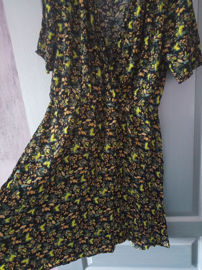 Jolie Robe d'été fluide Taille L "Cache Cache" Couleur: Fond Noir avec motifs colorés multicolores Manches courtes Grande légèreté, fluide Forme style cache coeur Dimensions: Longueur 98cm - aisselles à aisselles environ 53cm - épaule à épaule 40cm Matière: fluide Robe en très bon état, portée 2 fois