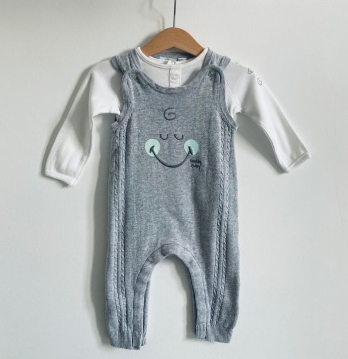 - 1 salopette longue grise avec smiley avec son teeshirt ML blanc le tout de marque Ochestra.