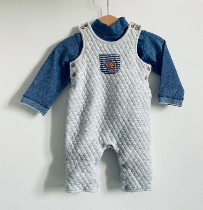 - 1 salopette matelassée grise avec son col roulé bleu marine assorti le tour de marque Cadet Rousselle.