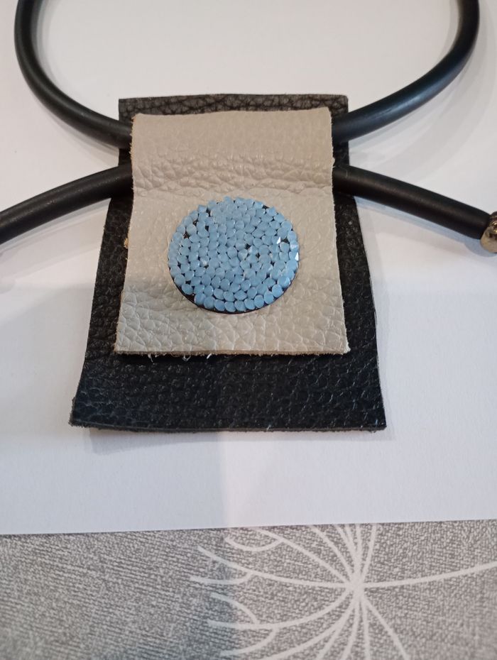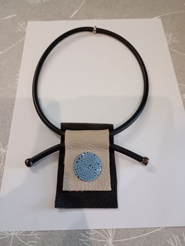 Collier en caoutchouc avec empiècements en cuir avec perles bleutées. Longueur : 27 cm. Empiècement noir : 9,5 x 6,5 cm. Les perles sont un peu décolorées. Bon état.