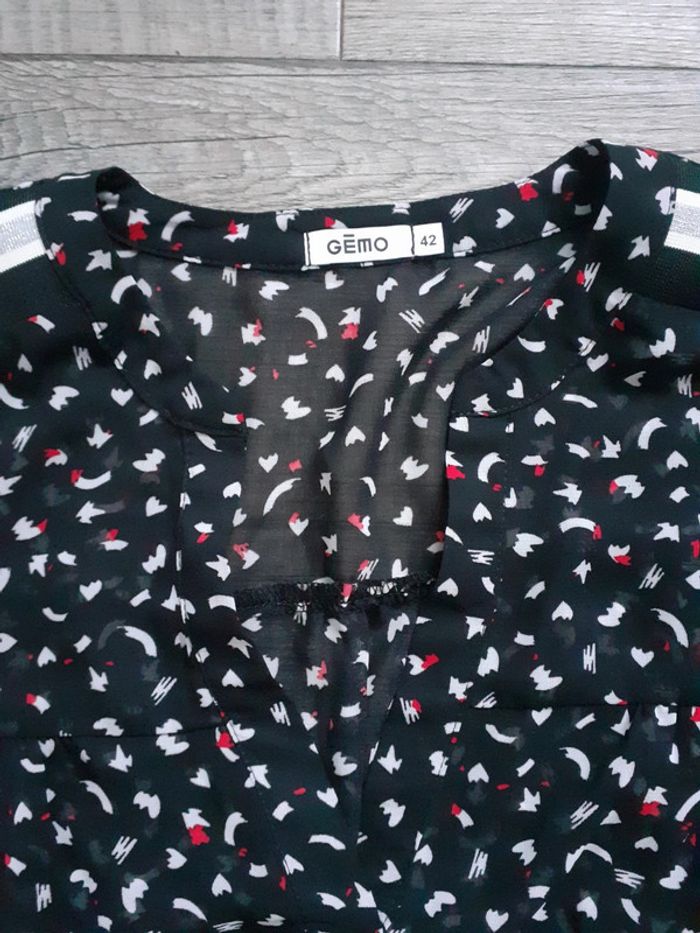 Neuve jamais portée, taille 42 ou XL, manches longues, motifs rouge et blanc, légère et fluide, un peu transparente, achetée neuve jamais portée, ce n'est plus mon style Pus long derrière (70 cm ) que devant (65 cm)