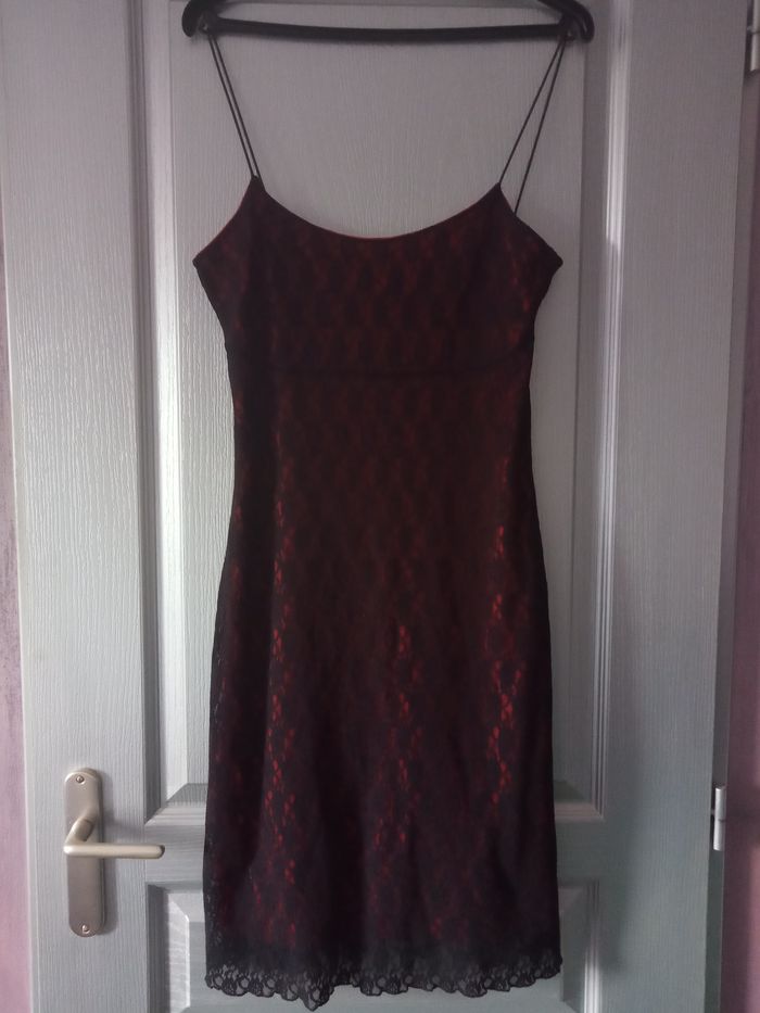 Ravissante Robe d'été Taille L "Jennyfer" Couleur: Rouge et Noir à très fines bretelles non réglables Forme élégante S'enfile, se porte près du corps Doublure intérieure rouge et l'extérieur est noir comme de la dentelle Dimensions: Longueur 73cm - aisselles à aisselles environ 40cm Matière: 39% Polyester + 61% Polyester Robe d'occasion en parfait état