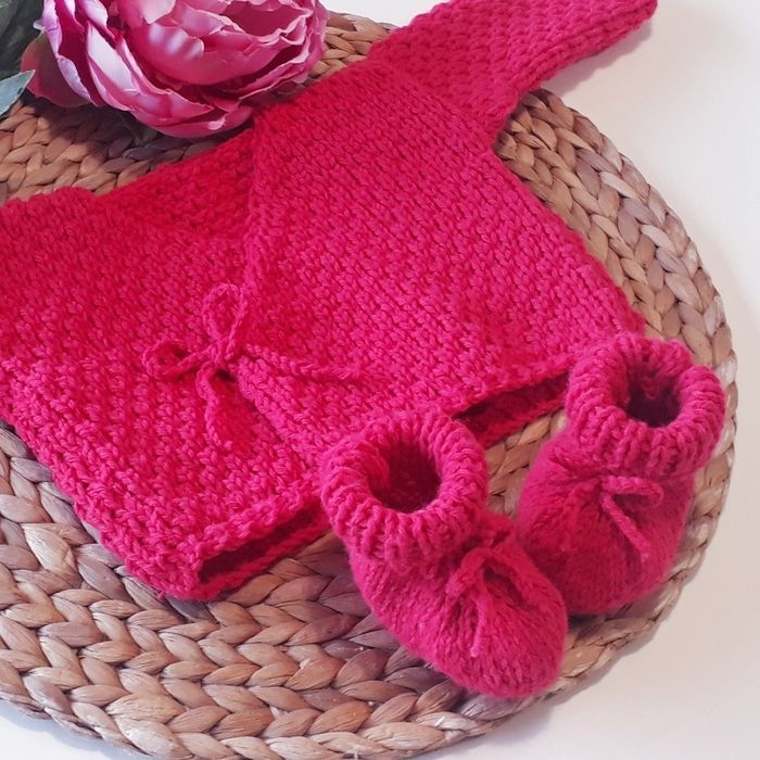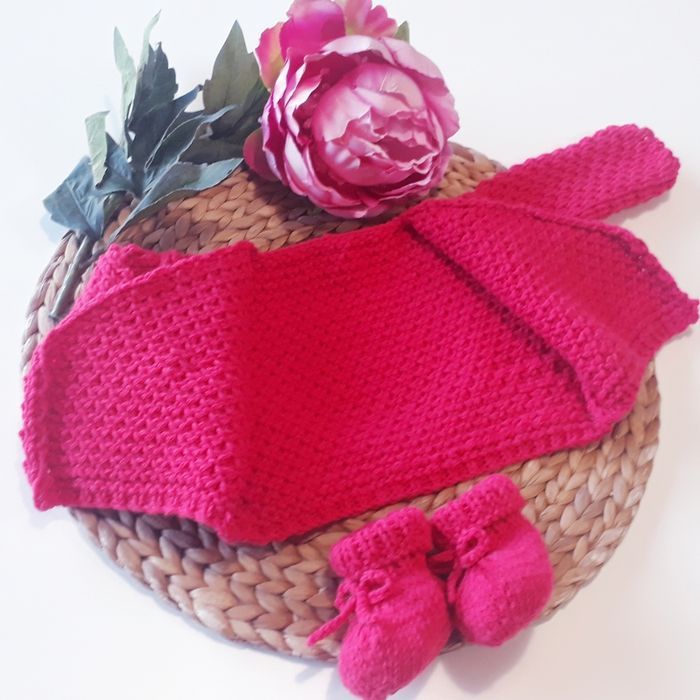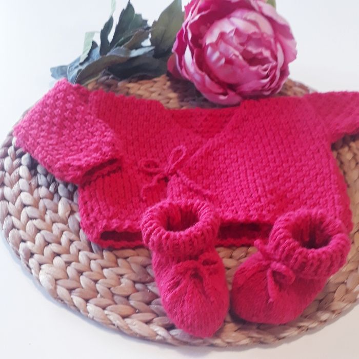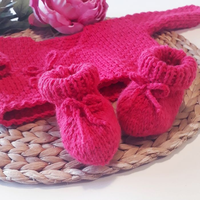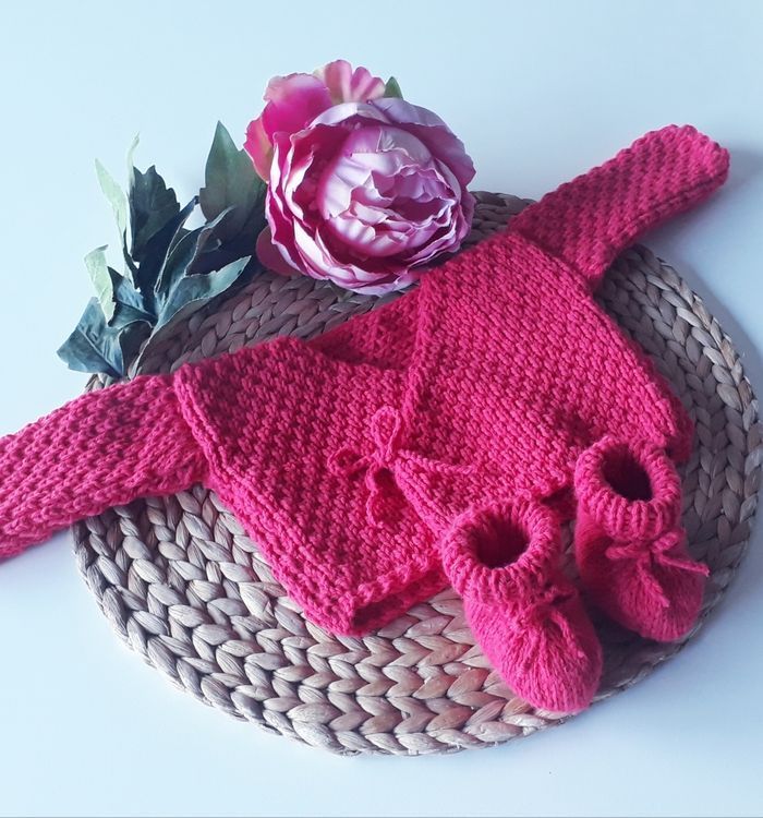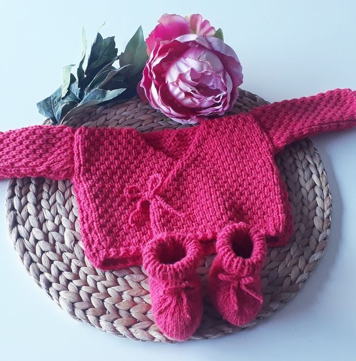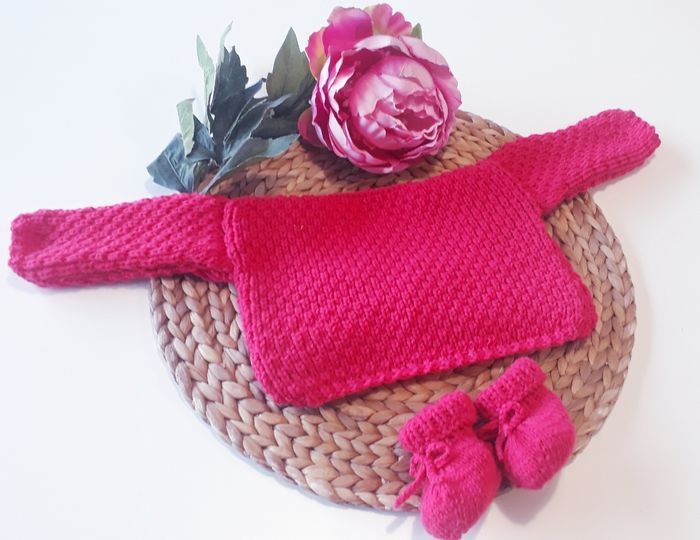 Ce modèle est prévu pour la sortie de maternité, mais si vous souhaitez faire une taille plus grande n'hésitez pas à me le demander 😉. Possibilité de faire d'autres couleurs. Composition : - 30% laine - 50% polyamide - 20% acrylique Entretien facile : - Programme laine (30°c) - Essorage doux 400 tr/min - Pas de sèche linge ni repassage