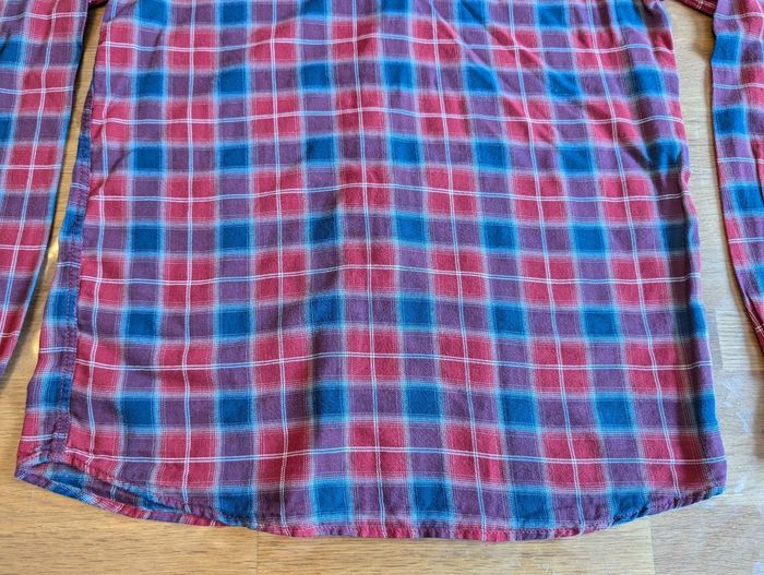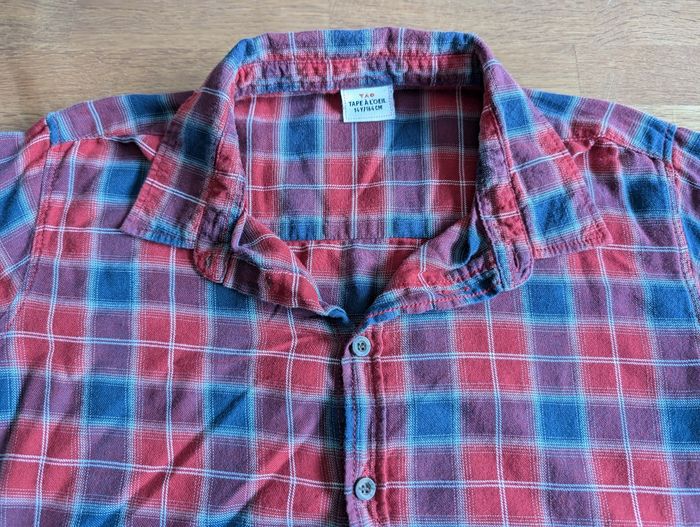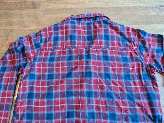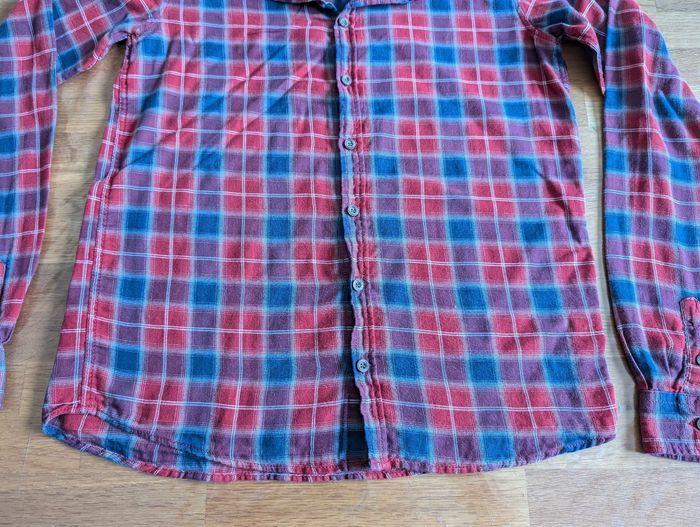 Chemise garçon 12 -14 ans Tape à l'oeil Rouge, bleu, bordeaux, la couleur ressort mieux sur la dernière photo. Très bon état, un tout petit fil tiré sur le devant qu'il doit être possible de faire disparaitre. Tissu léger Notée en 14 ans mais me semble pas très grande. Étiquette intérieure coupée.