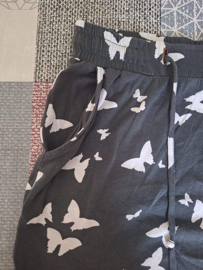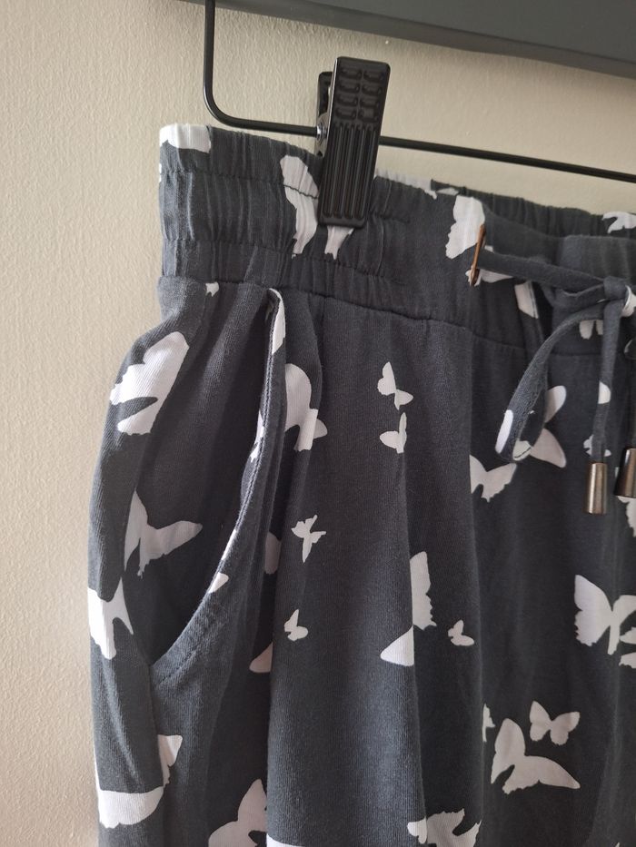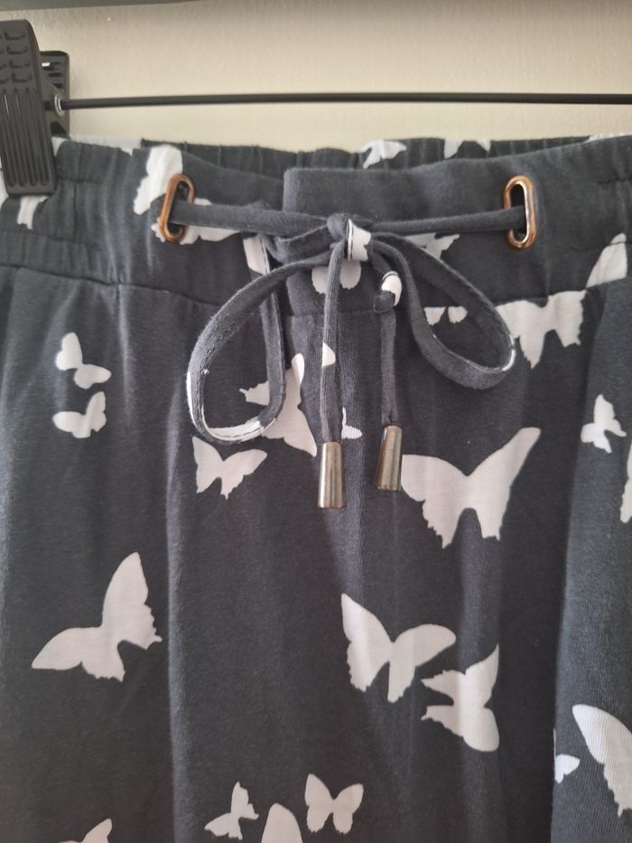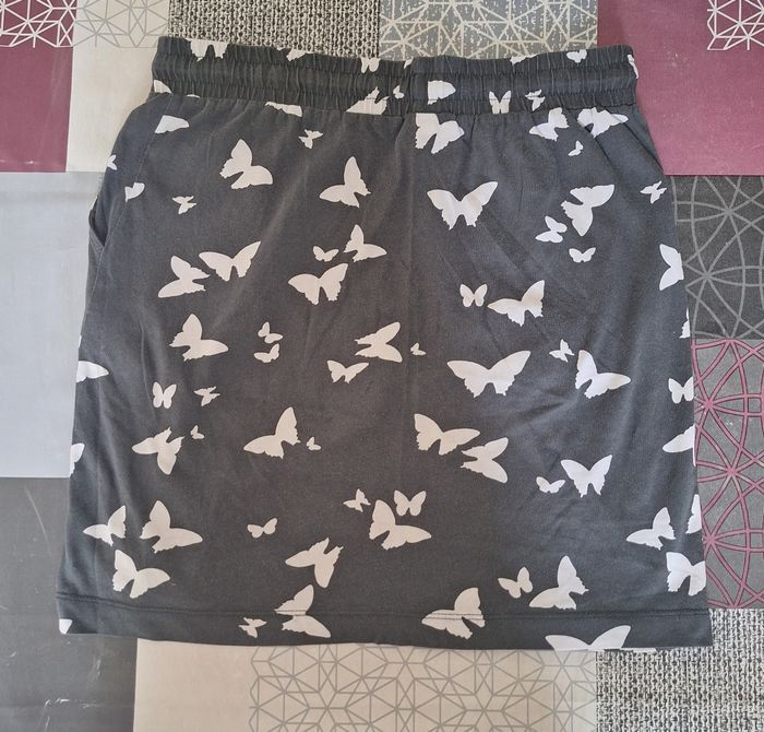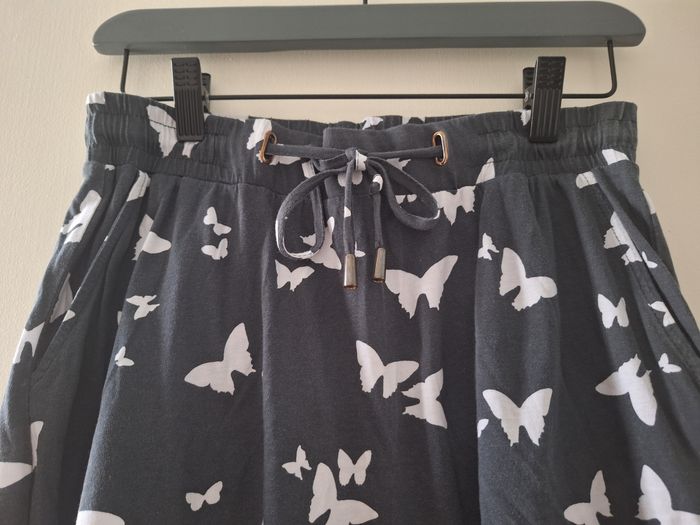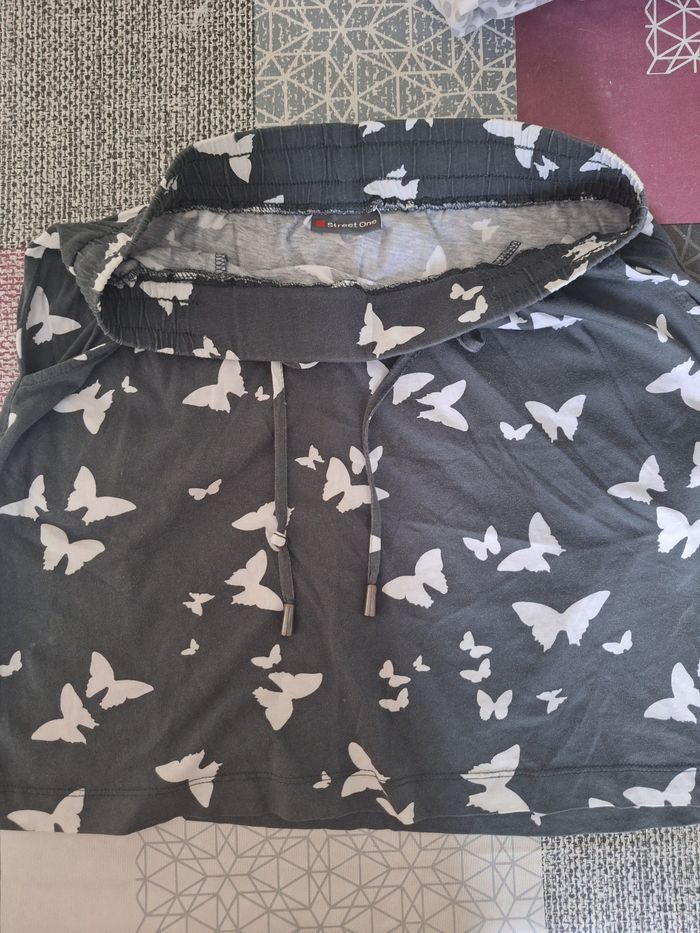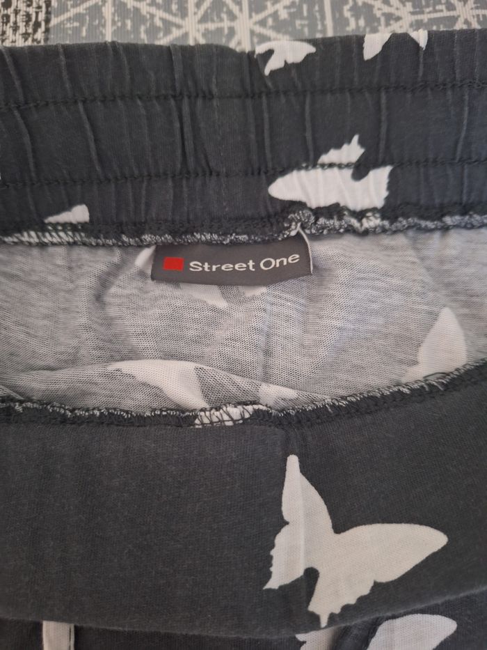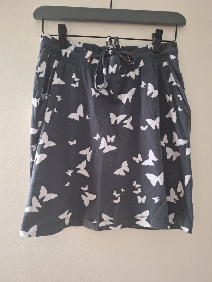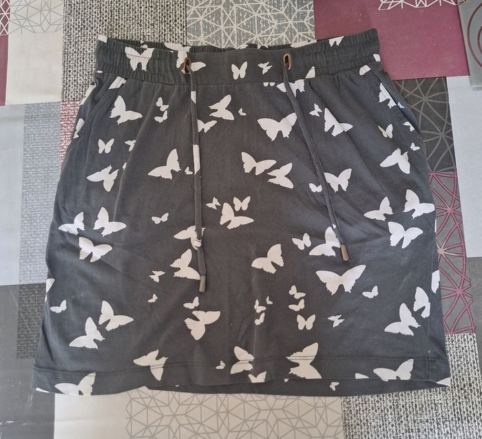 Jupe en très bon état malgré qu'elle a besoin d'être repassé Longueur 42 cm Largeur taille 36 cm mais élastique avec en plus un galon De marque Street One avec 1 grande poche de chaque côté Gris foncé et blanc taille 36 38