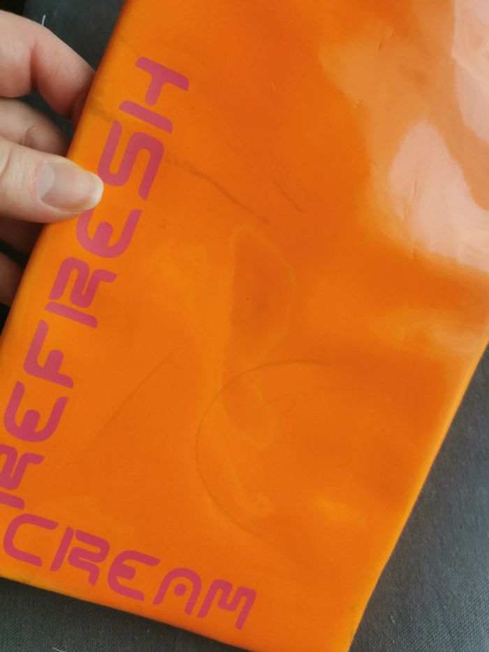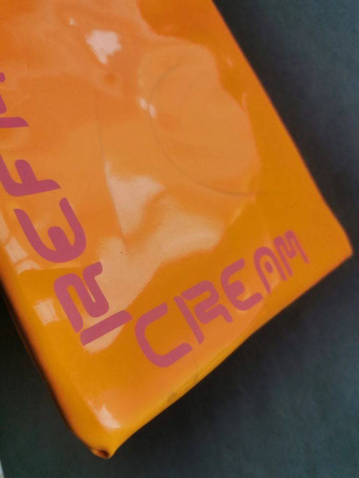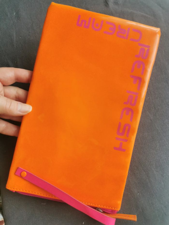 Pochette isotherme rectangulaire orange vitaminé, neuve! Juste a perdu un peu de sa couleur au soleil, traces. Pochette plastifiée brillante avec l'inscription "Refresh cream" et une poignée rose, l'intérieur est isotherme et elle se ferme par une fermeture éclair. Son poids fait 100 gr et sa taille rectangulaire plate 25 x 14,5 cm; Une très jolie pochette flashy (couleur vive orange). #pochetteorange #pochetteisotherme