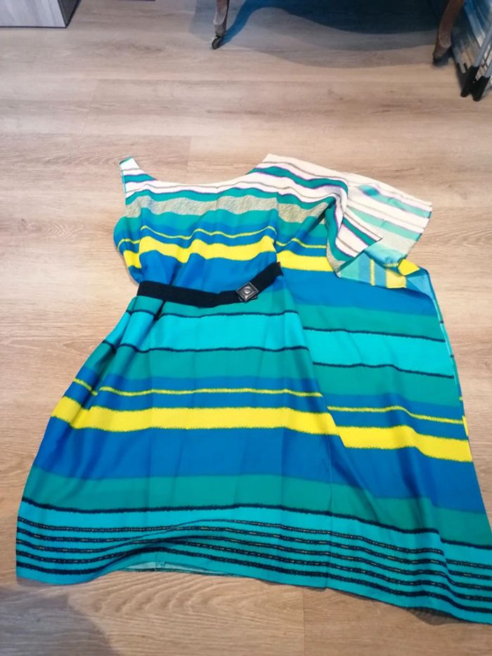 Bonjour, je vends cette robe asymétrique dans les tons de bleu/vert de la marque manoukian vendue avec ceinture taille XS en très bon état. Lavé maison non fumeur.